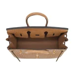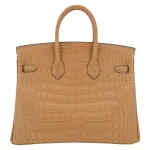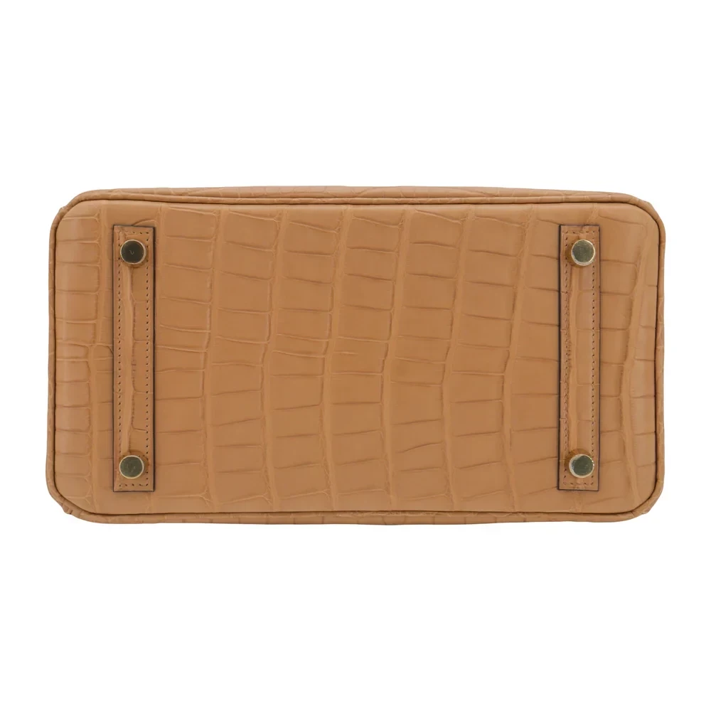 This Hermès style Birkin 25 glows in Chai matte alligator leather, a warm caramel brown. Gold hardware elevates the 25cm design with opulent contrast. Matte alligator resists scratches and stays sleek. Compact yet fits essentials like a phone and wallet. Pair with earthy tones for autumnal elegance. Lightweight and perfect for refined minimalists.