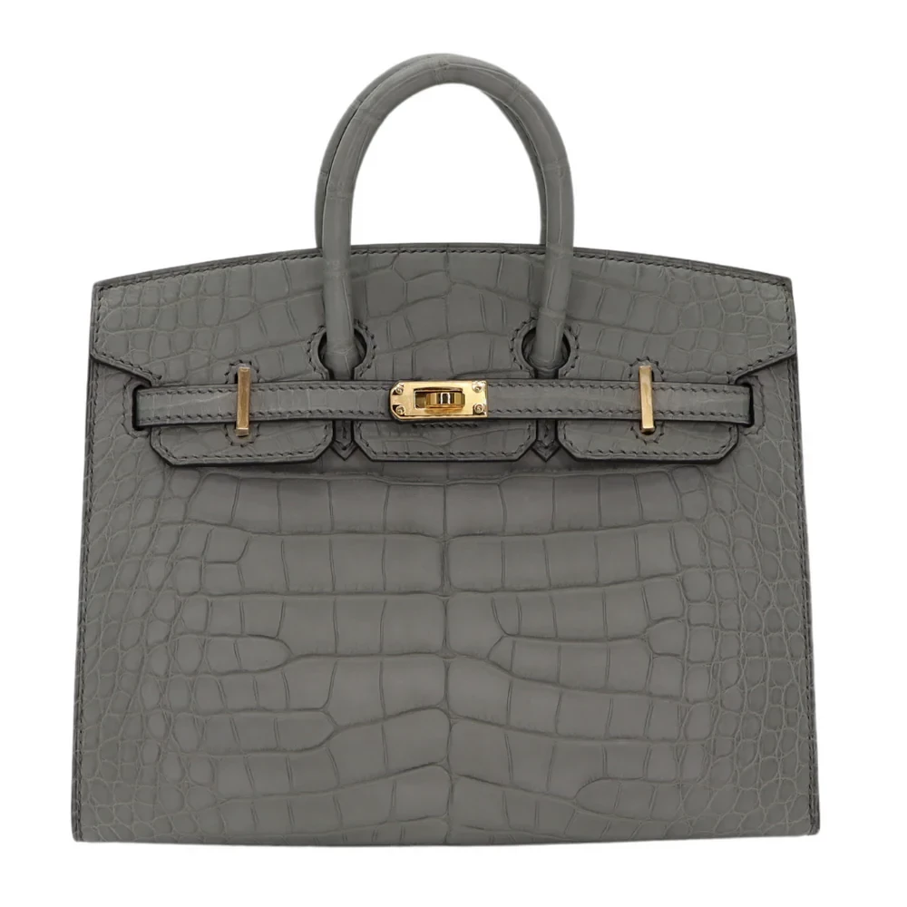 This Hermès style Birkin 20 Sellier features Gris Cement matte alligator leather for a cool, industrial edge. Gold hardware adds warmth to the structured 20cm design. Scratch resistant matte alligator stays sleek and fingerprint free. Compact yet fits essentials like a phone and cardholder. Pair with monochrome outfits for minimalist chic. Perfect for evenings out or polished daytime looks. Modern luxury in a petite package.