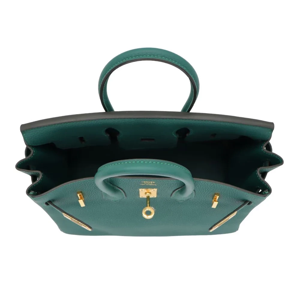 This Hermès style Birkin 25 glows in Malachite Togo leather, a deep emerald green shade. Gold hardware amplifies the jewel toned 25cm design. Scratch resistant Togo leather stays smooth for daily wear. Compact yet holds essentials like cards and keys. Pair with black or metallics for dramatic contrast. Lightweight and perfect for evenings out. A lush, nature inspired masterpiece.