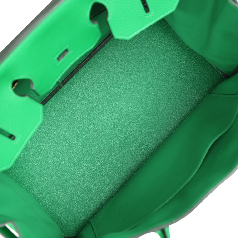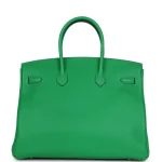 This Hermès inspired Birkin 35 boasts Bambou Clemence leather for a vibrant, grassy green hue. Gold hardware accents the relaxed, slouchy profile. The 35cm design carries books, tablets, and lunch boxes. Clemence leather resists scratches and softens over time. Pair with neutral tones or gold accessories for lively contrast. Fits parks, offices, or weekend markets. Fresh energy in every detail.