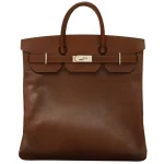 This Hermès style HAC 40 features Terre Volynka leather in earthy brown. Palladium hardware enhances the rustic texture. The 40cm design offers rugged functionality for daily use. Durable leather develops character over time. Perfect with neutral or autumnal outfits. Your companion for urban adventures. Raw luxury with soul.