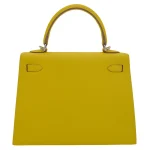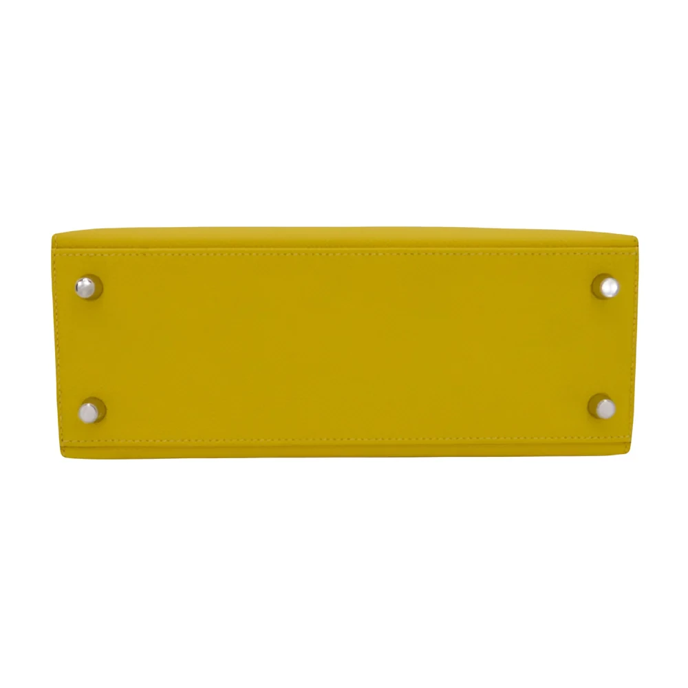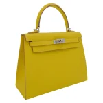 This Hermès style Kelly 25 features Lime Epsom leather in zesty green. Palladium hardware cools the vibrant tone. The 25cm sellier design holds tablets and essentials securely. Scratch resistant leather stays bright for seasons. Pair with white or neutral outfits for fresh contrast. Perfect for summer events or tropical vacations. Bold color meets everyday practicality.