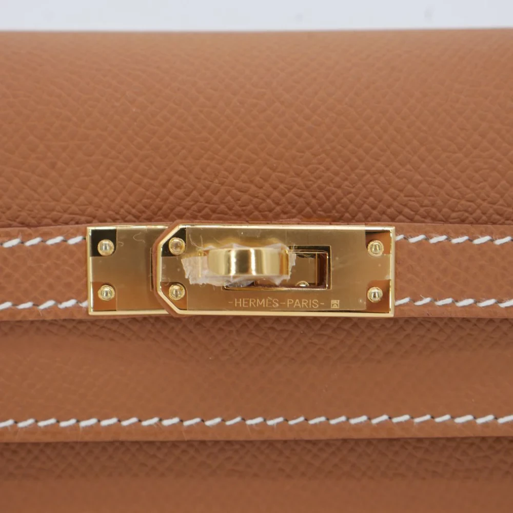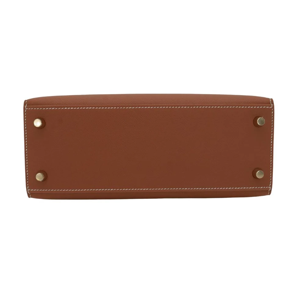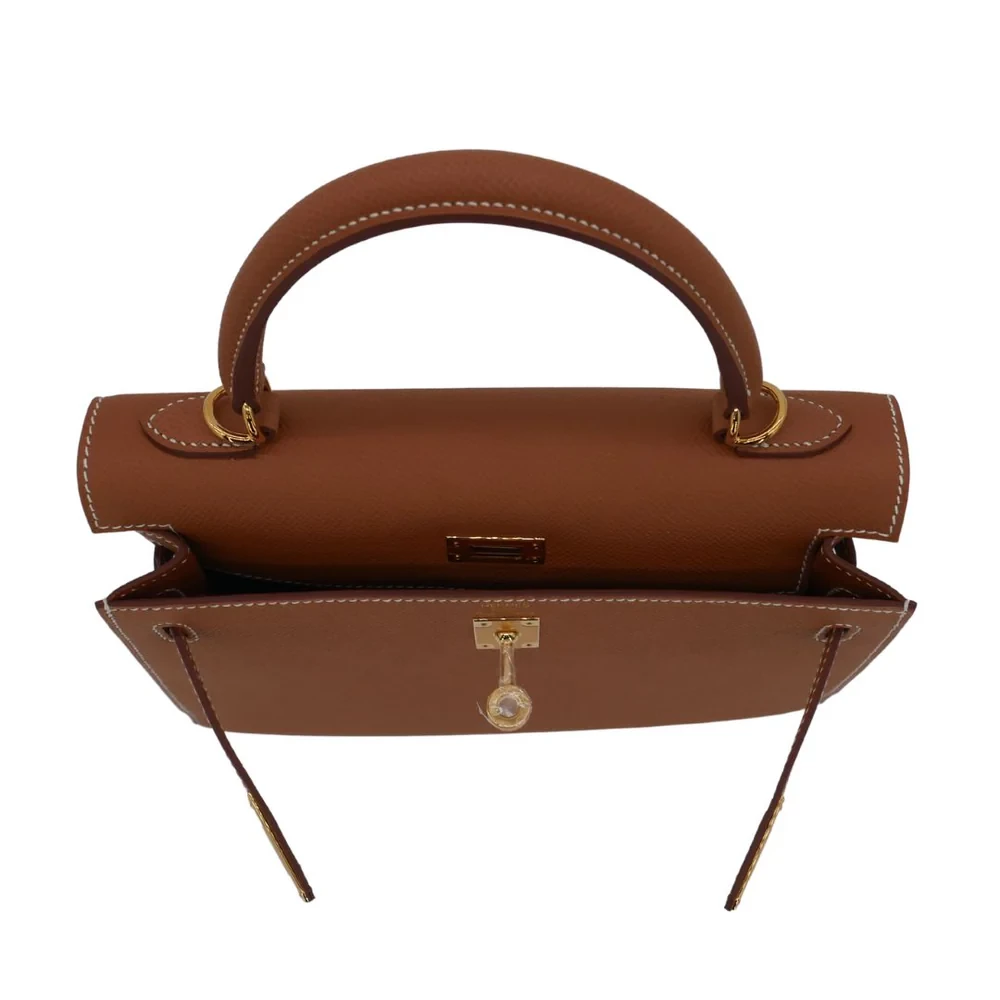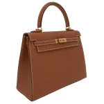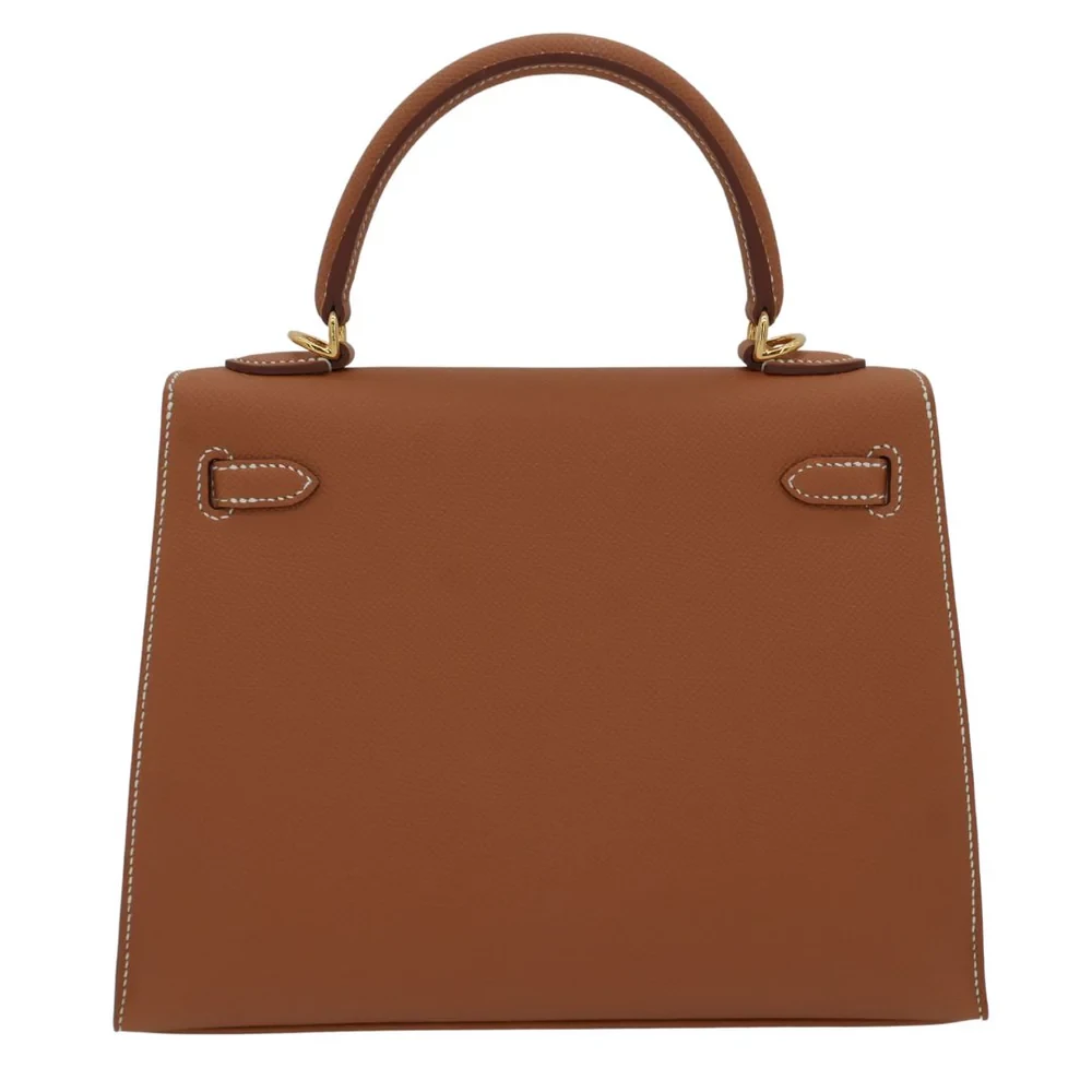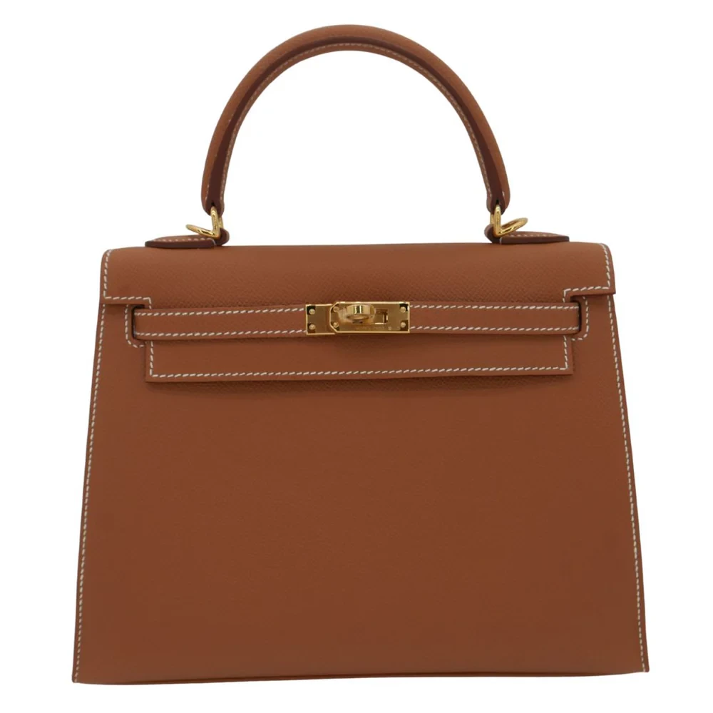 This Hermès style Kelly 25 shines in Gold Epsom leather. Matching gold hardware creates harmonious warmth. The 25cm sellier design stays structured and polished. Stain resistant surface stays pristine season after season. Pairs with earth tones or metallics for rich contrast. Perfect for weddings or holiday parties. Gilded luxury for golden moments.