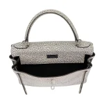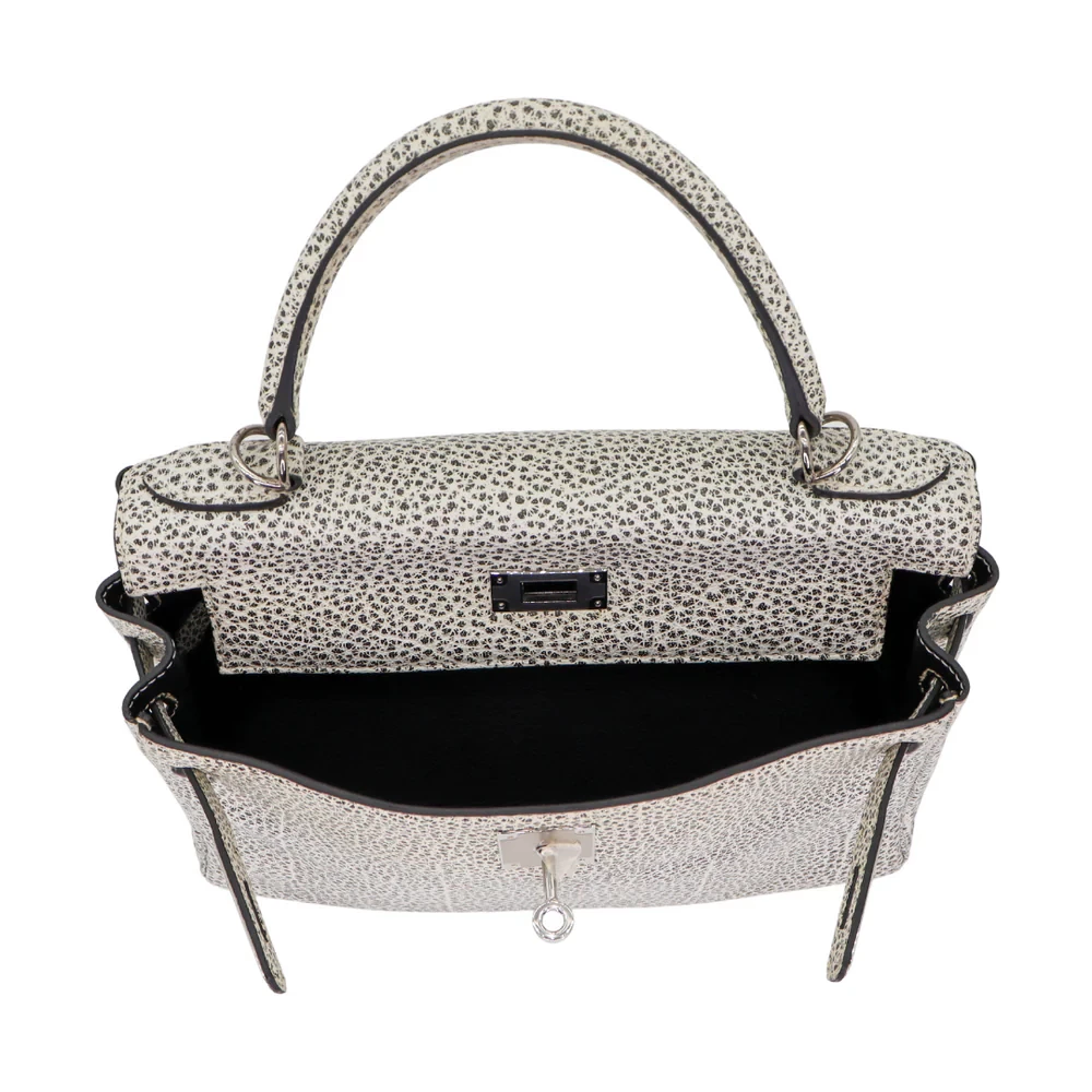 This Hermès inspired Kelly 28 showcases Dalmatian buffalo leather for unique spotted texture. Palladium hardware complements the relaxed, slouchy retourne style. The 28cm size holds tablets, notebooks, and daily essentials. Buffalo leather is rugged, scratch resistant, and ages beautifully. Style with neutrals or leather jackets for bold contrast. Built for urban adventures, travel, or casual chic. Wild sophistication, tamed.
