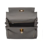 This Hermès style Kelly 28 features Gris Etain Togo in smoky grey. Gold hardware adds warmth to the cool neutral. The retourne design offers relaxed elegance for daily use. Soft leather molds comfortably to your body. Pairs with metallics or pastels for contrast. Your perfect transitional bag for all seasons. Quiet luxury for refined tastes.
