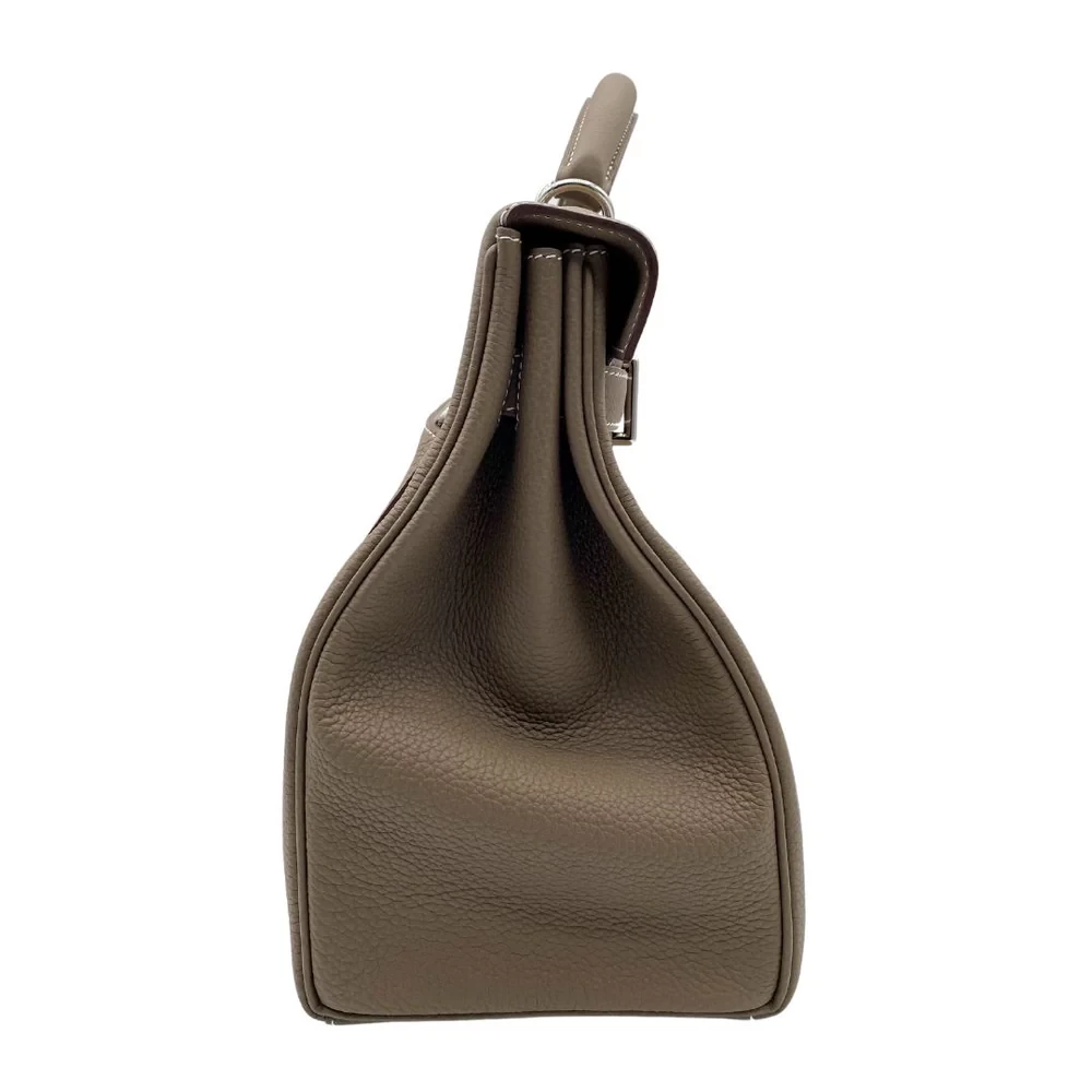 This Hermès style Kelly Maxi uses Etoupe Togo leather. Palladium hardware complements the grey brown. The 42cm size organizes work essentials. Scratch resistant grain hides wear. Perfect for minimalist professionals. Understated power in every detail.