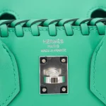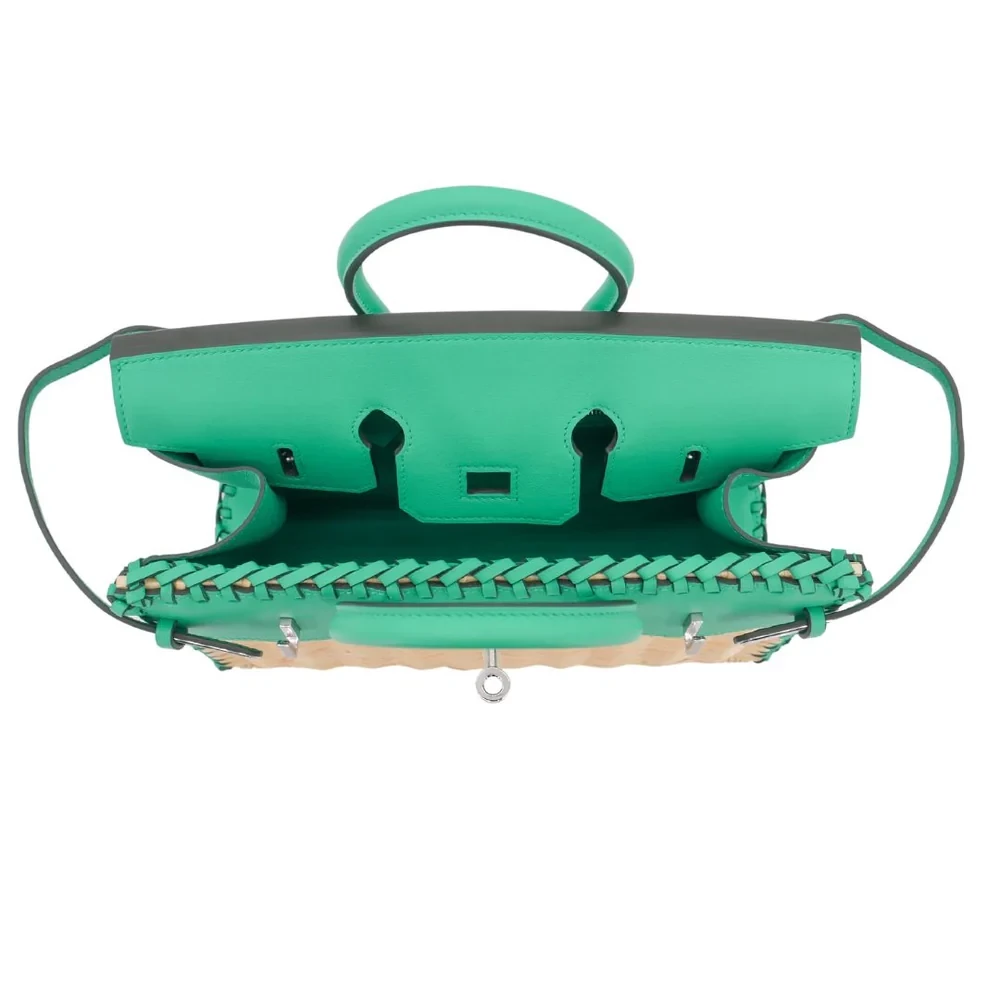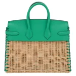 This Hermès Dupe Birkin 25 combines Menthe Swift leather with natural wicker. Palladium hardware complements the fresh design. The 25cm size is perfect for summer outings. Unique materials make it lightweight yet durable. Your perfect garden party companion. Refreshing luxury for sunny days.