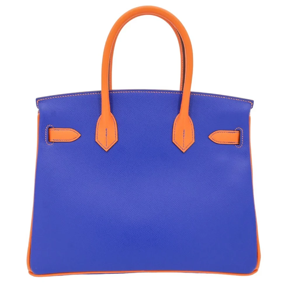 This Hermès style Birkin 30 HSS mixes Bleu Electrique and Orange Epsom leather for electric contrast. Brushed gold hardware bridges the vibrant 30cm design. Stiff Epsom leather retains its structured shape. Roomy enough for laptops or gym gear. Pair with neutrals to let the colors pop. Office ready or weekend bold. A jolt of playful energy.