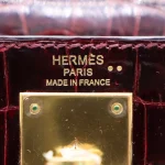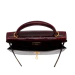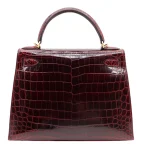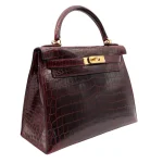 This Hermès Dupe Kelly 28 features Bordeaux shiny crocodile leather. Gold hardware enriches the deep red. The sellier style offers structured elegance. Glossy finish wipes clean easily. Perfect for important events. Your perfect power bag for executives. Opulent luxury for success.