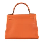 This Hermès style Kelly 28 features Feu Clemence leather in fiery orange red. Gold hardware amplifies the warm, energetic tone. The retourne design fits laptops and files comfortably. Soft leather develops a natural sheen over time. Style with neutrals for bold contrast. Ideal for autumn events or creative workplaces. Vibrant luxury for passionate souls.