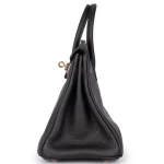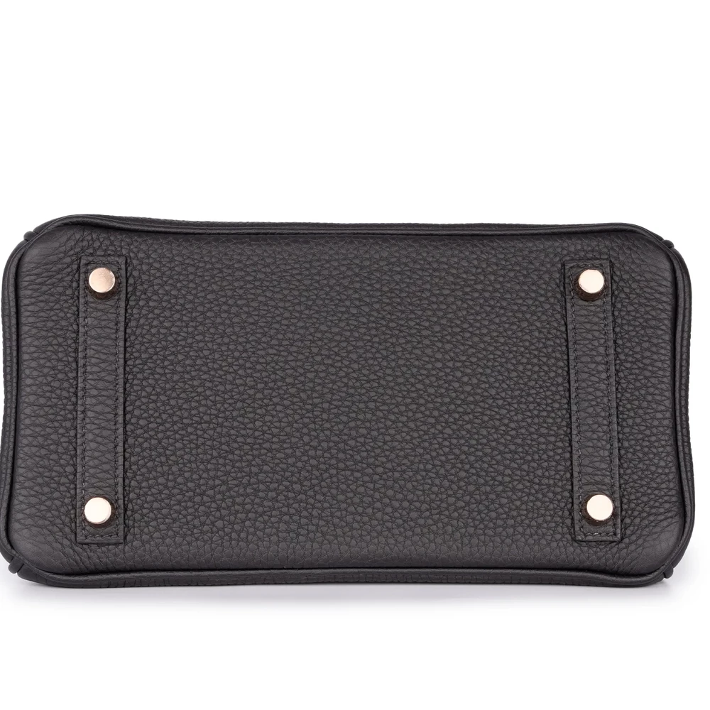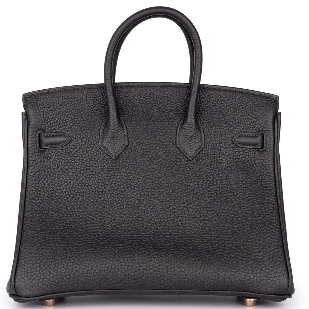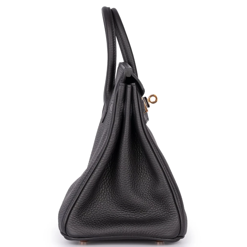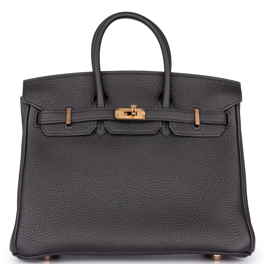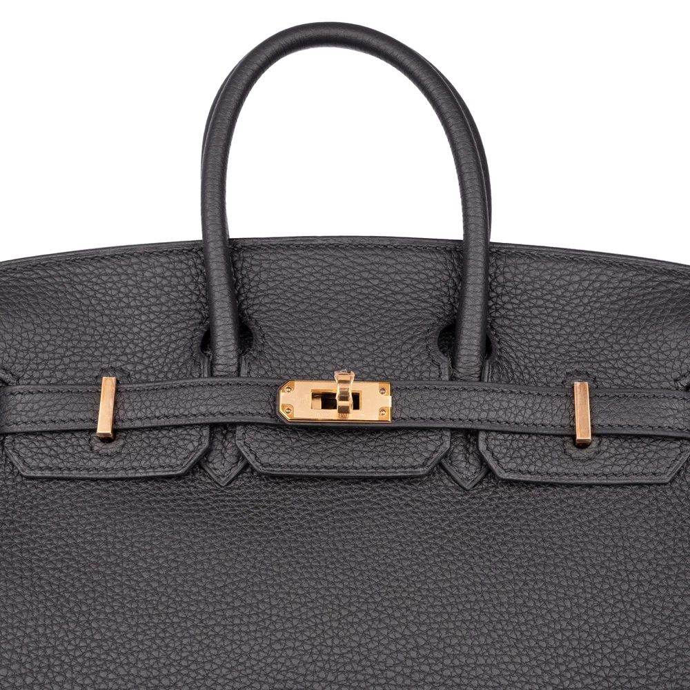 This Hermès Birkin 25 combines Noir (black) Togo leather with rough gold hardware for edgy contrast. The 25cm slouchy design holds essentials like tablets and wallets. Togo leather resists wear and stays soft. Pair with leather jackets or metallics for rebellious flair. Built for nights out, travel, or bold errands. Sleek rebellion.