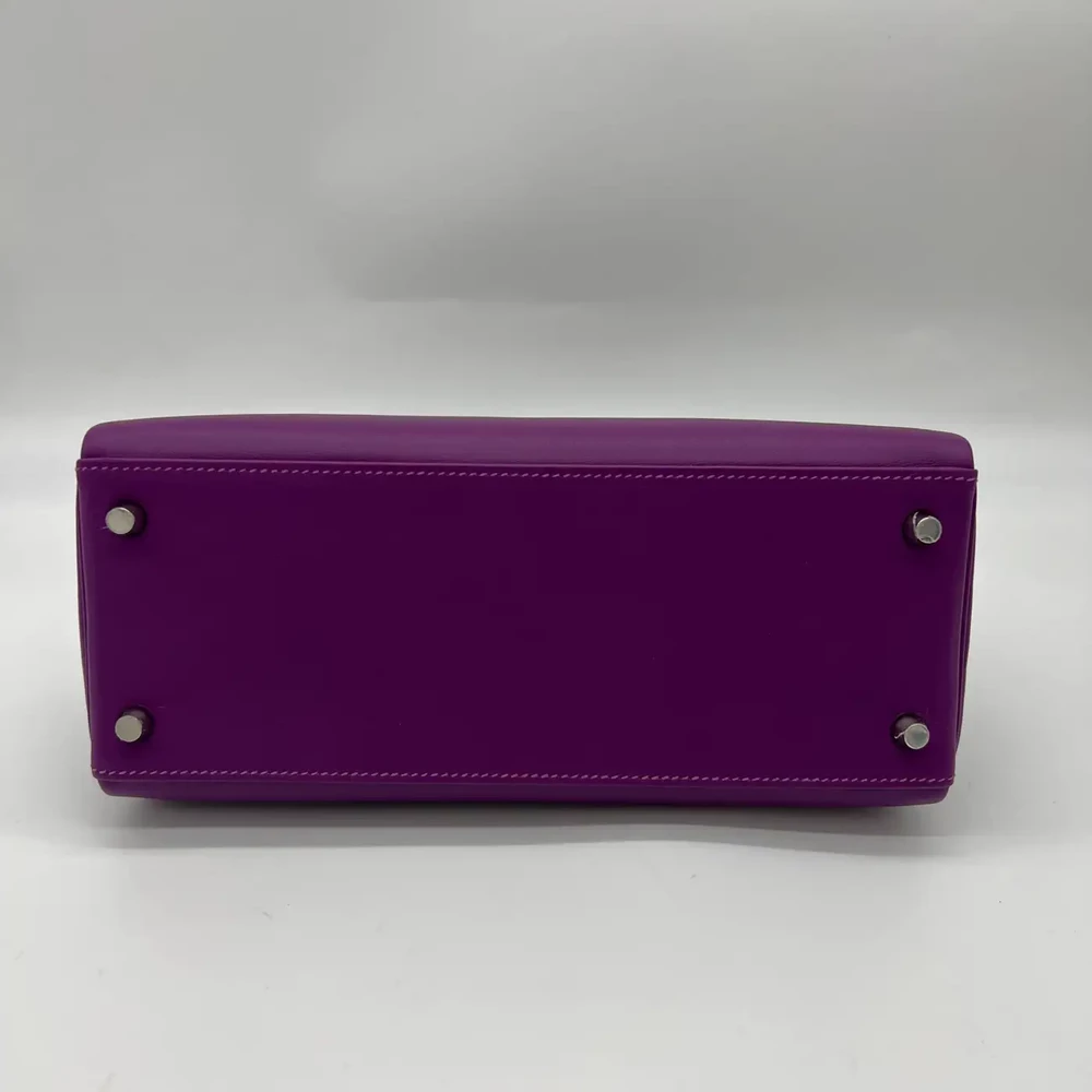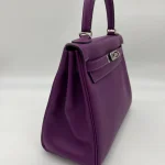 This Hermès style Kelly 28 uses Anemone Togo leather in regal purple. Palladium hardware cools the bold jewel tone. The retourne design offers relaxed elegance for daily wear. Scratch resistant leather hides minor scuffs. Pair with metallics or neutrals for contrast. Ideal for creative professionals or parties. Royal luxury for confident personalities.