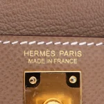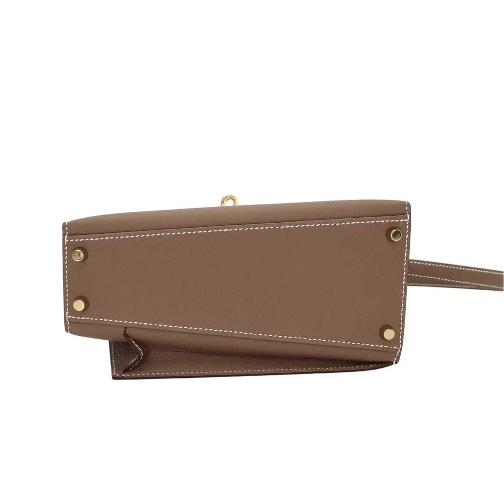 This Hermès inspired Kelly en Desordre uses Étoupe Epsom leather for neutral, utilitarian appeal. Gold hardware contrasts with the bag’s unfinished, rugged edges. The 25cm design fits tablets, notebooks, and daily essentials. Epsom leather resists wear and stays rigid. Pair with earth tones or metallics for industrial chic. Ideal for creative studios, travel, or streetwear. Unrefined elegance, perfected.