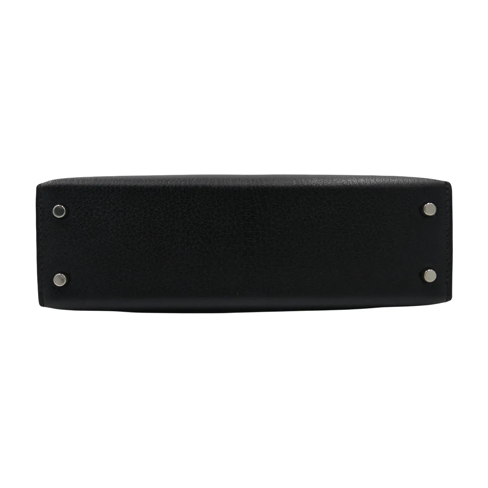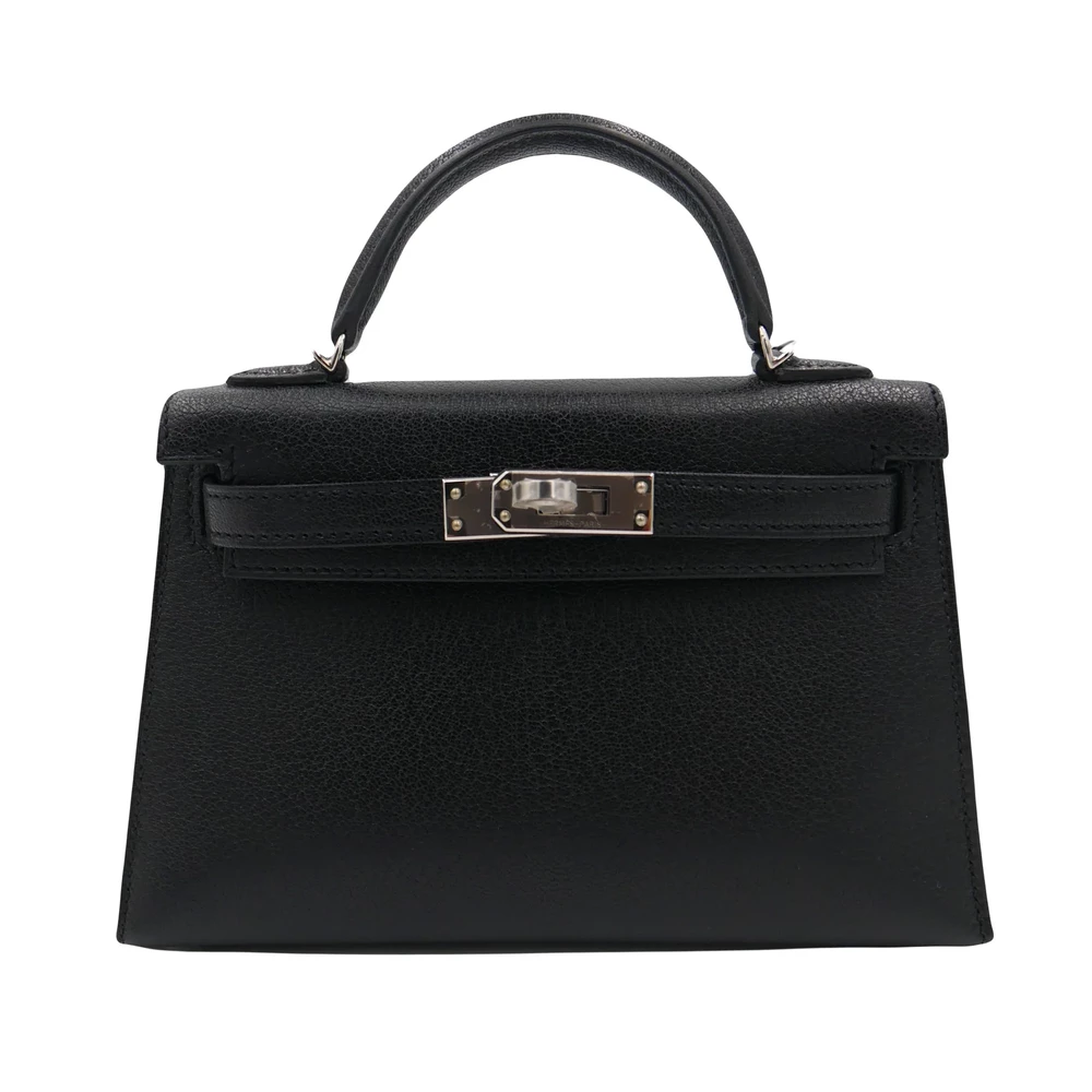 This Hermès style Kelly Mini uses Black chèvre leather. Palladium hardware adds sleek contrast. The 20cm sellier design stays polished. Soft leather resists daily wear. Elevates evening wear or office attire. Your perfect versatile clutch. Timeless elegance in compact form.