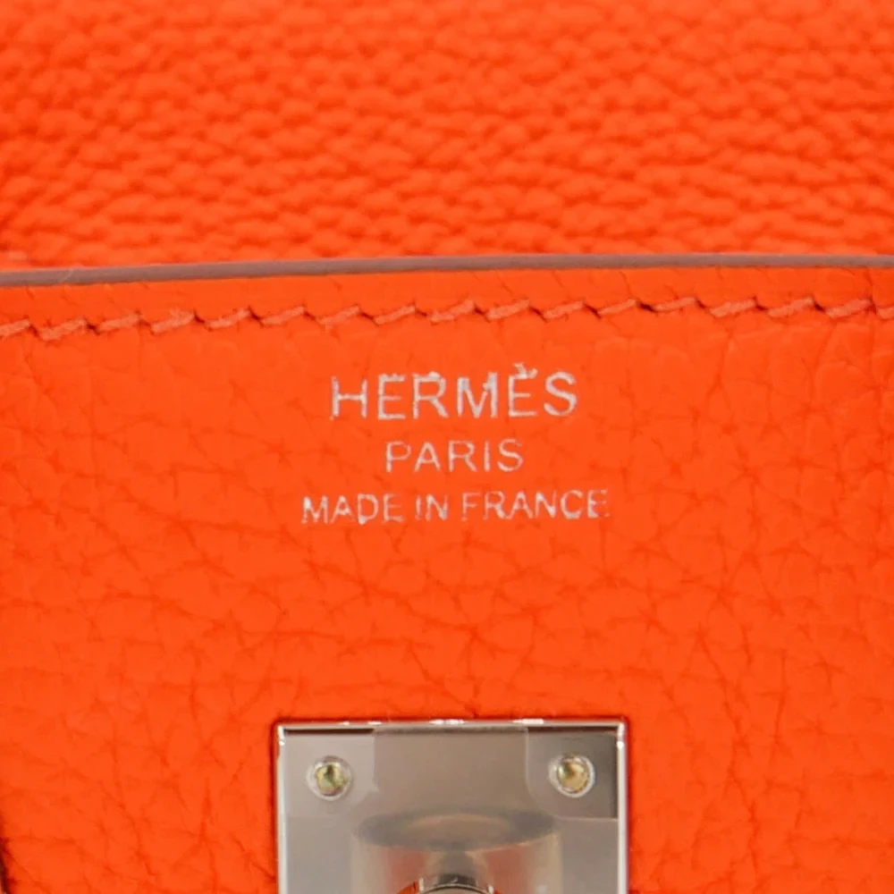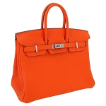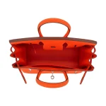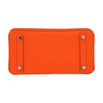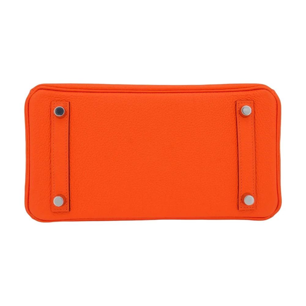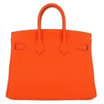 This Hermès inspired Birkin 25 pops in Orange Minium Togo leather, a vibrant tangerine hue. Palladium hardware cools the 25cm design with modern contrast. Soft Togo leather resists scratches and stays supple. Compact yet fits essentials like cards and keys. Pair with neutrals for playful flair. Perfect for beach trips or summer outings. Sunshine in bag form.