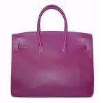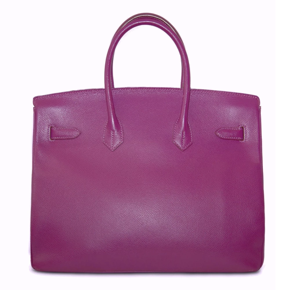 This Hermès inspired Birkin 35 showcases Anemone Epsom leather for a vivid, jewel toned finish. Palladium hardware accents the sharp lines and modern sangles. The 35cm structured design secures laptops and files neatly. Epsom leather resists rain and daily wear. Contrast with neutrals or layer with prints for daring style. Built for work, events, or fashion forward errands. Boldness perfected.