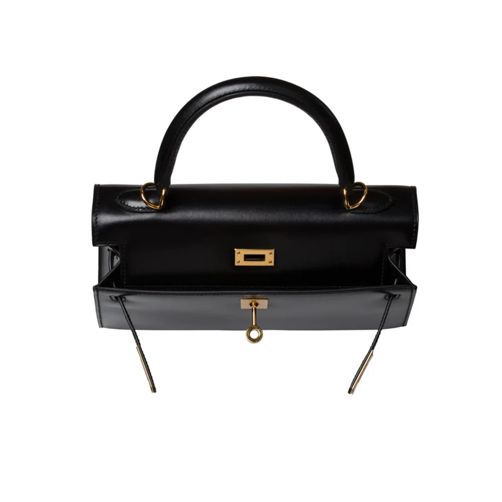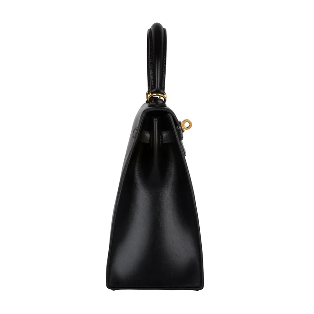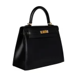 This Hermès style Kelly 25 uses Black Box Calf leather. Gold hardware enhances the mirror like shine. The sellier design holds essentials with polished precision. Glossy leather develops rich patina with age. Perfect for formal events or important meetings. Timeless elegance in every stitch. Luxury that commands attention.