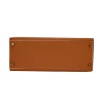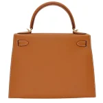 This Hermès style Kelly 28 shines in Gold Epsom leather. Matching gold hardware creates harmonious warmth. The sellier design stays structured for work essentials. Stain resistant surface stays pristine season after season. Elevates earth tones or metallics effortlessly. Perfect for weddings or holiday parties. Gilded luxury for golden moments.