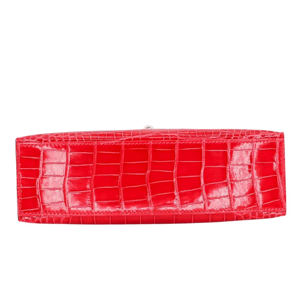 This Hermès inspired Kelly Pochette glows in Rose Extreme Shiny Alligator leather for electric pink allure. Palladium hardware accents the compact, structured silhouette. The pochette size fits lipsticks, cards, and small luxuries. Shiny alligator resists scratches and stays eye catching. Pair with monochromes or metallics for fearless pop. Ideal for parties, festivals, or summer nights. Vibrant audacity, mastered.