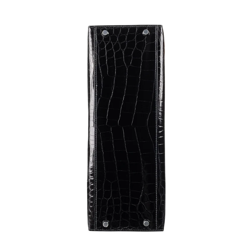 This Hermès inspired Kelly 32 features Black Shiny Niloticus crocodile leather for bold, glossy texture. Palladium hardware accents the slouchy retourne silhouette. The 32cm spacious design fits laptops, files, and travel gear. Niloticus crocodile is durable and weather resistant. Pair with leather jackets or evening gowns for edgy contrast. Built for travel, work, or luxury errands. Commanding sophistication.