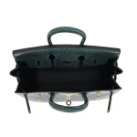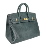 This Hermès style Birkin 20 Sellier glows in Vert Cypress shiny lizard leather, a forest green jewel tone. Gold hardware elevates the compact 20cm design. Lizard skin resists scratches and feels opulent. Fits essentials like lipstick and cards. Pair with earth tones for organic elegance. Perfect for dinners or garden parties. Nature’s luxury redefined.