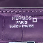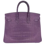 This Hermès inspired Birkin 25 shines in Amethyst matte alligator leather, a deep purple hue. Palladium hardware cools the 25cm design with modern edge. Matte alligator resists scratches and stays sleek. Compact yet fits essentials like cards and keys. Pair with black or metallics for regal contrast. Ideal for evening events. Jewel toned sophistication.