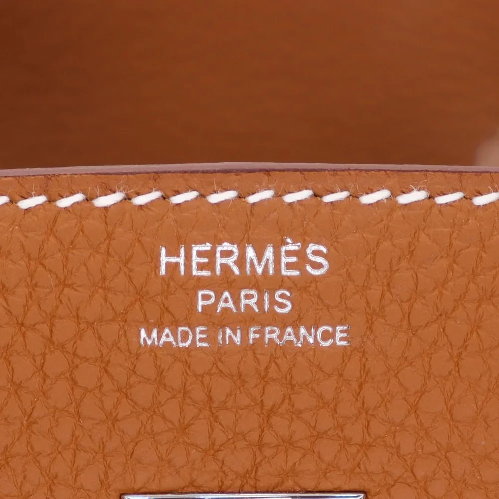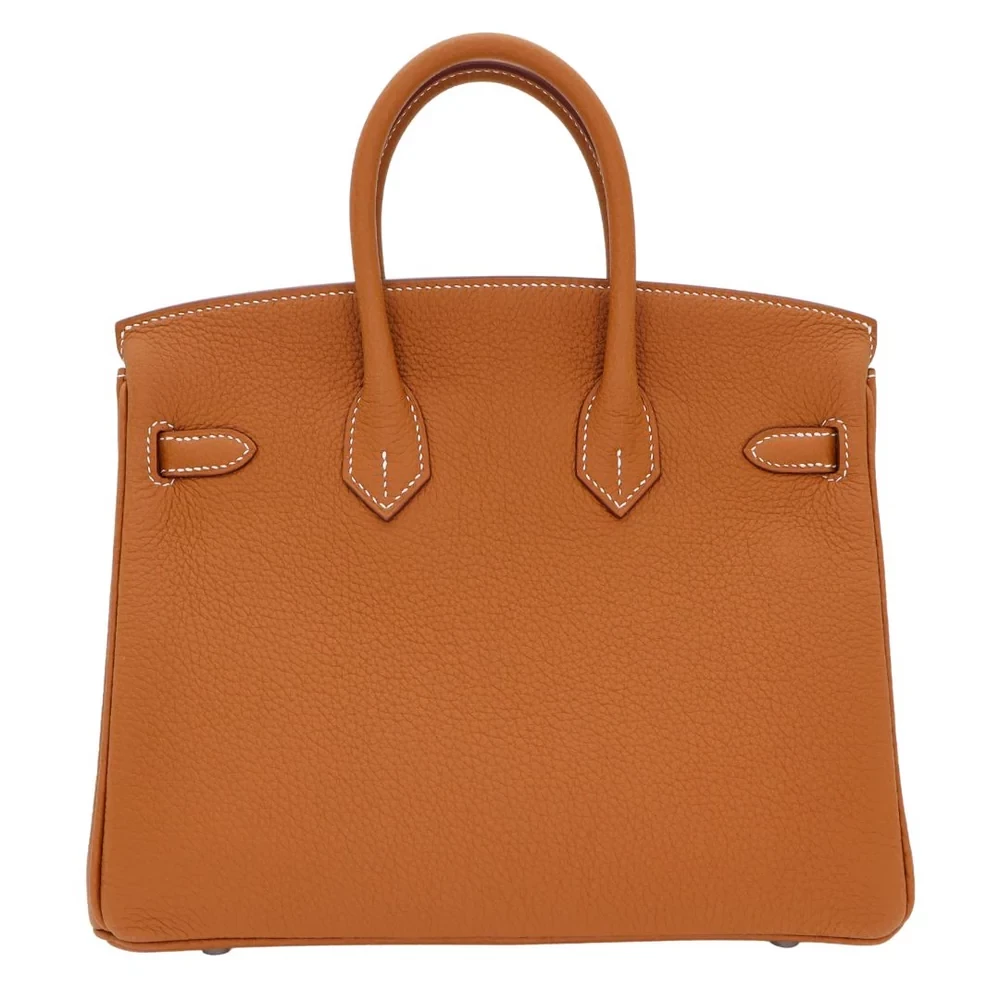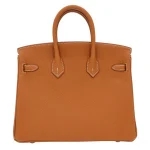 This Hermès style Birkin 25 shines in Gold Togo leather, a warm caramel gold hue. Palladium hardware adds a cool, modern edge to the 25cm design. Soft Togo leather resists scratches and ages gracefully. Compact yet fits essentials like a phone and wallet. Pair with neutrals or jewel tones for versatility. Lightweight and perfect for day to night transitions. A golden classic for understated luxury.