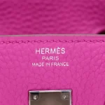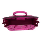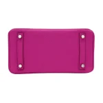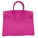 This Hermès inspired Birkin 25 features soft pink Togo leather. The silver palladium hardware keeps the look fresh and modern. The 25cm size is lightweight and easy to carry. The pale pink color is perfect for spring or summer. Pair it with pastels or neutrals for a gentle glow. Scratch resistant leather stays looking new. A sweet bag for romantic vibes.