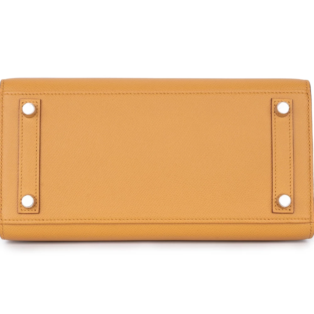 This Hermès inspired Birkin 25 features Sesame Epsom leather in soft beige. Palladium hardware keeps the look modern and fresh. The 25cm size holds essentials while maintaining crisp structure. Stain resistant Epsom stays pristine through daily use. Pairs with pastels or earth tones seamlessly. Ideal for brunches or daytime meetings. Quiet luxury for refined tastes.