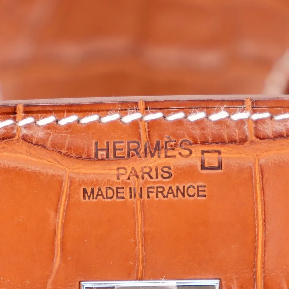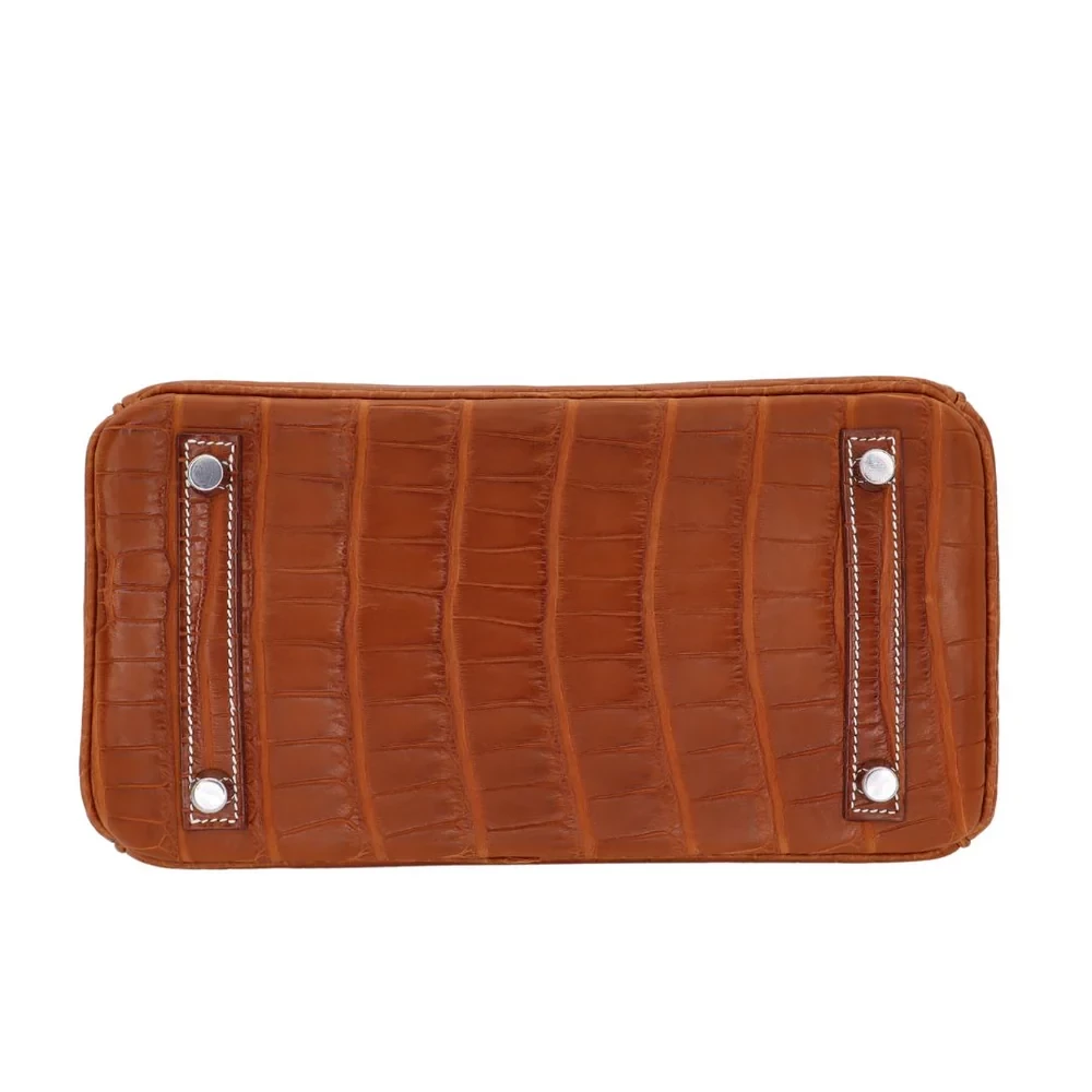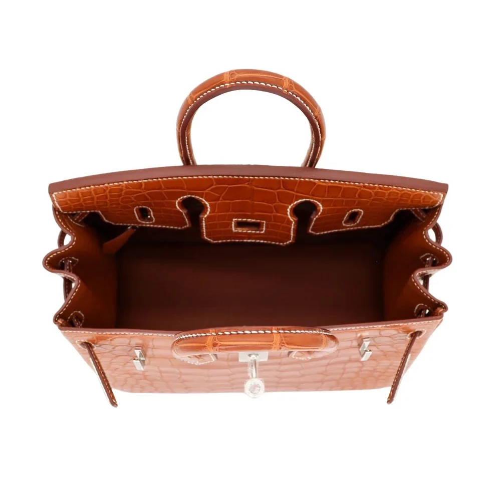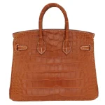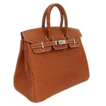 This Hermès inspired Birkin 25 features Fauve matte alligator leather, a warm caramel brown. Palladium hardware adds sleek contrast to the 25cm silhouette. Matte alligator resists scratches while retaining refined texture. Roomy enough for essentials like a phone and wallet. Pair with autumnal tones or neutrals for harmony. Lightweight and timeless for year round use. Earthy luxury with modern edge.