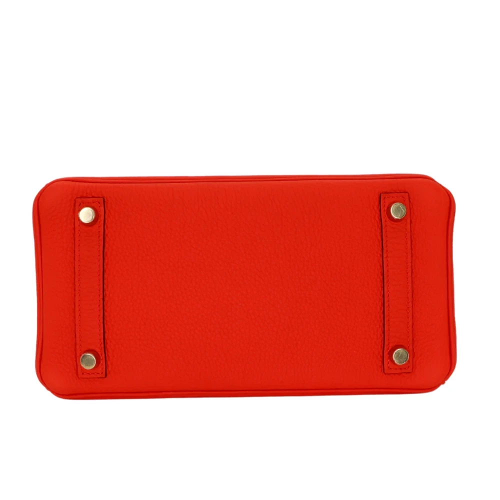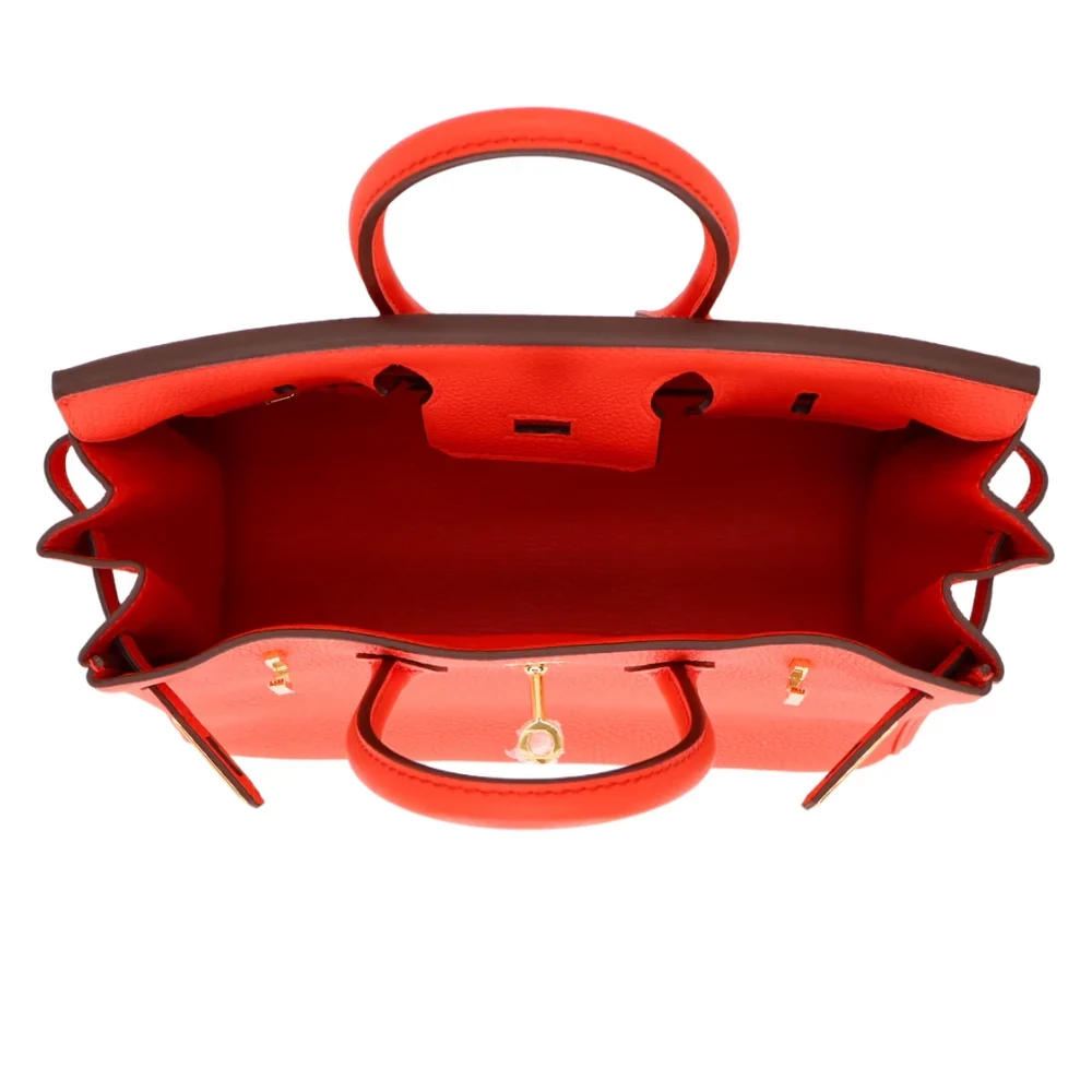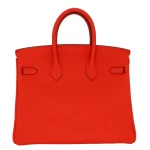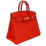 This Hermès inspired Birkin 25 shines in Feu Togo leather, a fiery orange red tone. Gold hardware amplifies the 25cm design’s vibrant energy. Soft Togo leather resists scratches and ages gracefully. Compact yet fits essentials like cards and keys. Pair with neutrals for bold contrast. Perfect for summer nights or artistic flair.