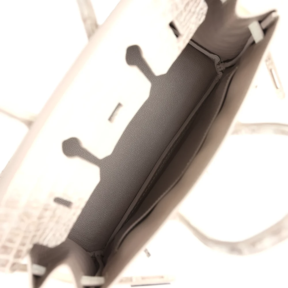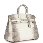 This Hermès inspired Birkin 25 features Blanc Himalayan crocodile leather with natural color variations. Palladium hardware cools the 25cm design with modern contrast. Exotic crocodile stays scratch resistant and eye catching. Compact yet fits essentials like cards and keys. Pair with metallics or neutrals for icy glamour. A winter white masterpiece.