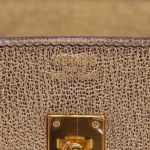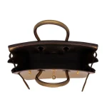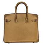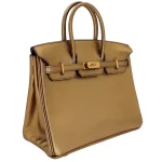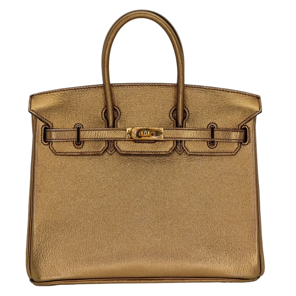 This Hermès inspired Birkin 25 shimmers in bronze metallic leather. The gold hardware amplifies the luxurious glow. The 25cm size is compact but holds your essentials. The metallic finish catches the light beautifully. Pair it with black or navy for a bold contrast. Perfect for parties or holiday events. A glamorous bag for special moments.