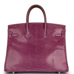 This Hermès Birkin 25 features Lizard Violet leather for exotic, iridescent purple texture. Palladium hardware accents the structured design and clean lines. The 25cm size fits phones, keys, and essentials. Lizard leather is durable and luxuriously glossy. Style with black outfits or metallics for evening drama. Built for events, travel, or collector’s displays. Regal mystique.