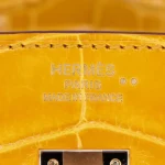 This Hermès inspired Birkin 25 glows in Jaune Ambre shiny Niloticus crocodile leather, a rich amber gold. Gold hardware amplifies the glossy, sunlit finish. The 25cm size fits essentials like cards and lipstick. Scratch resistant crocodile stays pristine. Pair with black or metallics for evening allure. Perfect for special occasions. Liquid gold luxury.
