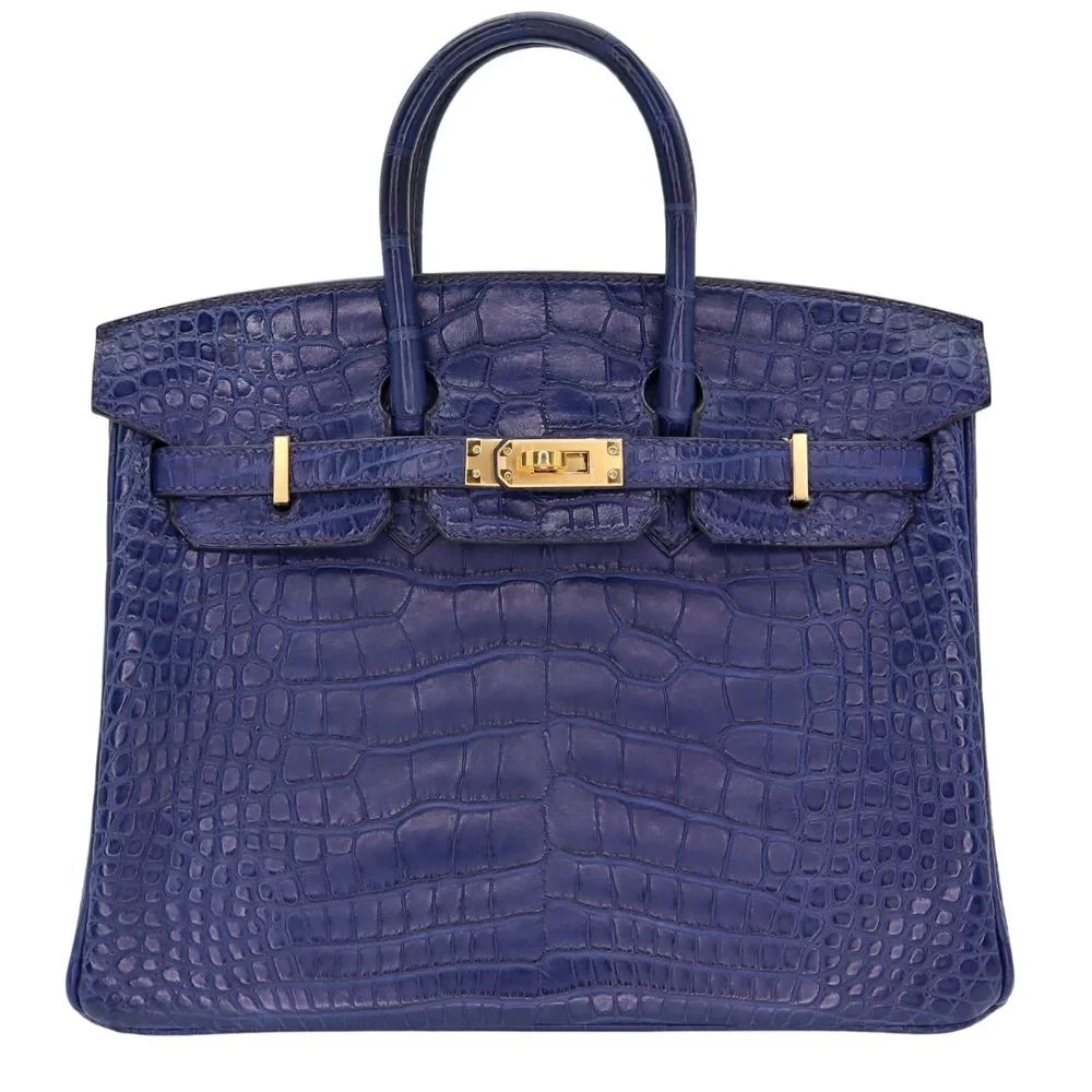 This Hermès style Birkin 25 features Bleu Saphir matte alligator leather, a deep sapphire blue shade. Gold hardware contrasts elegantly with the cool toned 25cm design. Matte alligator resists scratches while maintaining a refined texture. Compact yet fits essentials like cards, keys, and lipstick. Pair with neutrals or metallics for bold contrast. Lightweight and perfect for evenings out. A jewel toned masterpiece for modern elegance.