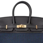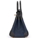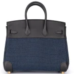 This Hermès Birkin 25 Retourne combines Toile Quadrille canvas and Swift Egee/Noire leather for textured contrast. Gold hardware highlights its casual, slouchy design. The 25cm size fits books, tablets, and daily essentials. Durable materials resist wear and water. Style with casual chic outfits or sporty layers for eclectic flair. Ideal for travel, markets, or weekend adventures. Rugged meets refined luxury.