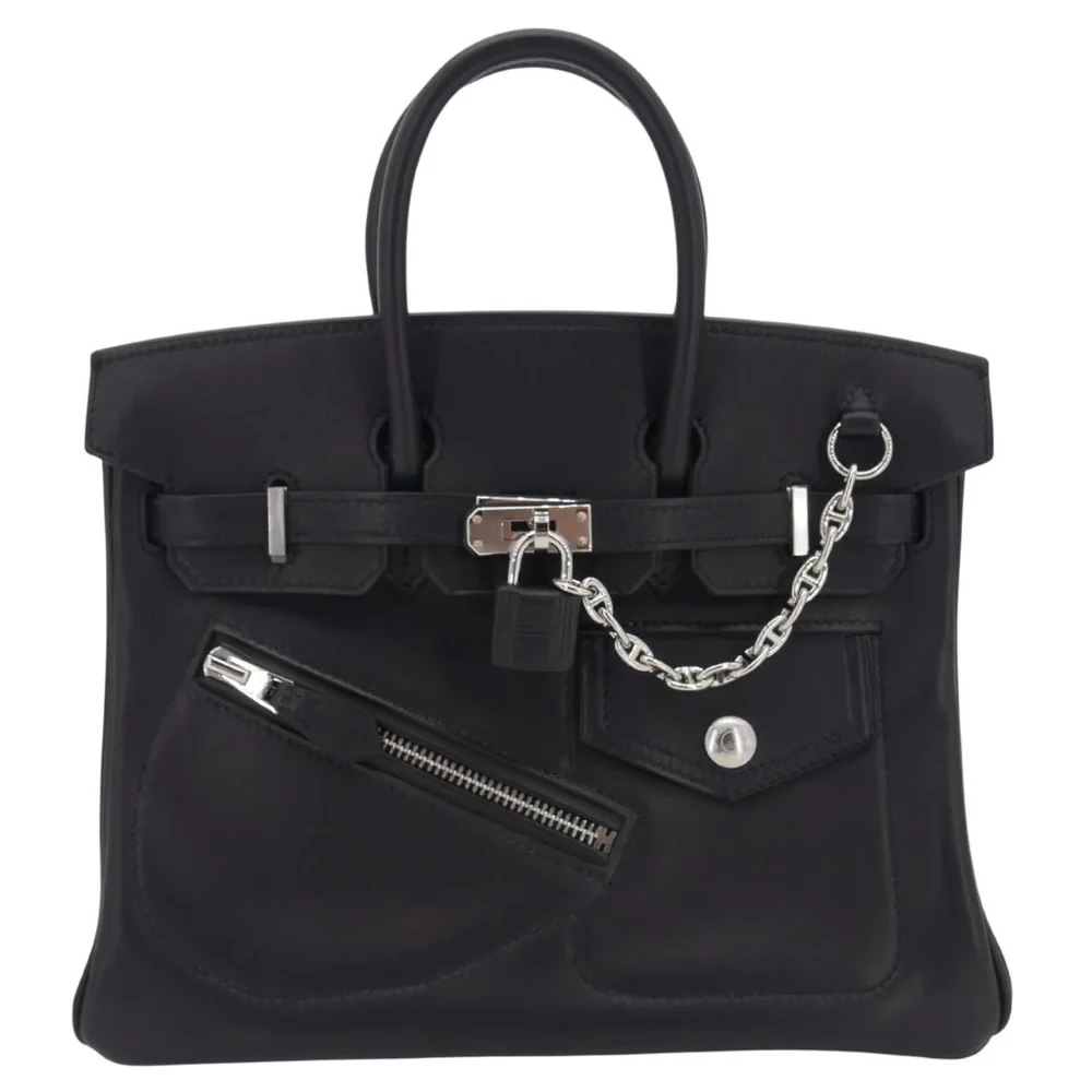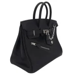 This Hermès Inspired Birkin 25 showcases Rock Black Volupto leather with textured finish. Palladium hardware gives edgy contrast. The 25cm size makes a bold statement. Unique leather resists scratches and wear. Perfect with leather jackets and jeans. Your perfect night out companion. Urban luxury with rocker vibes.