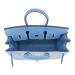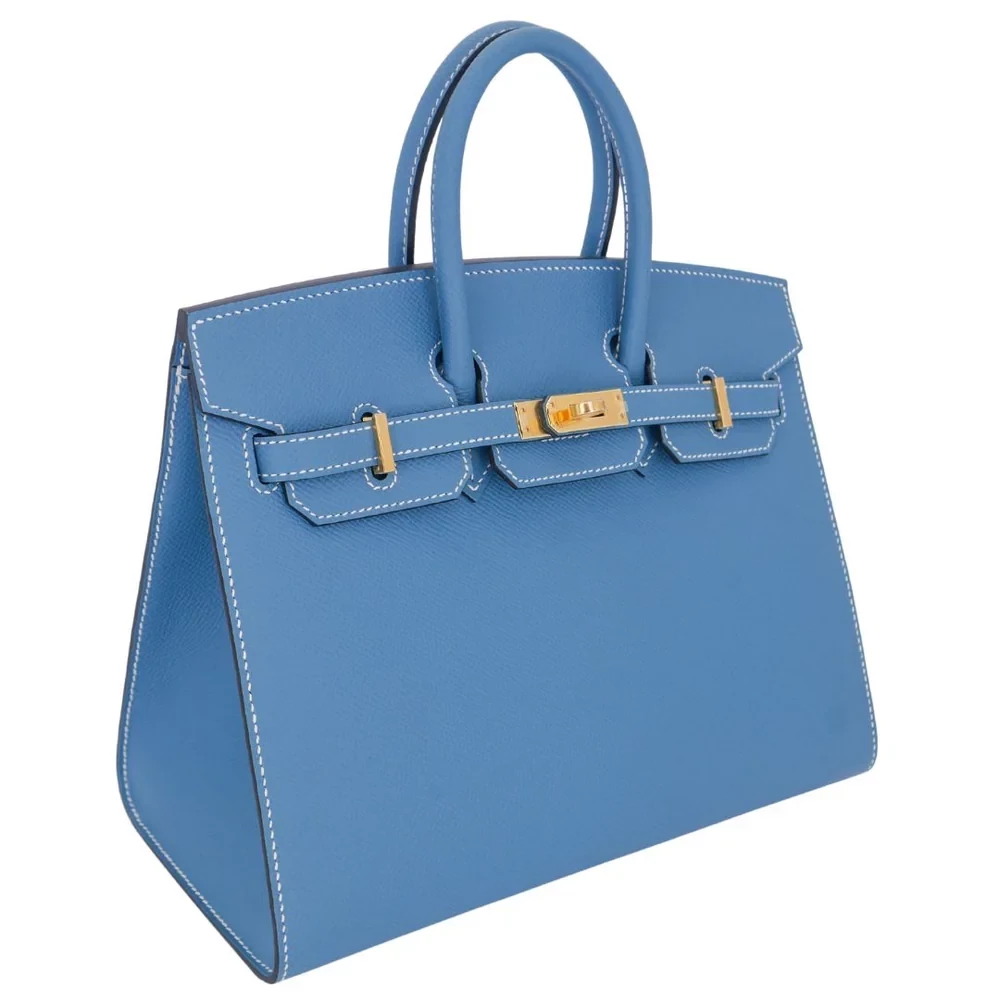 This Hermès Birkin 25 Sellier features Bleu Jean Epsom leather for a crisp denim blue finish. Gold hardware accents its sharp, structured silhouette. The 25cm size fits laptops, notebooks, and office essentials. Scratch resistant Epsom leather stays sleek and polished. Pair with jeans or neutral tones for modern contrast. Built for workdays, meetings, or city adventures. Sleek sophistication, every day.