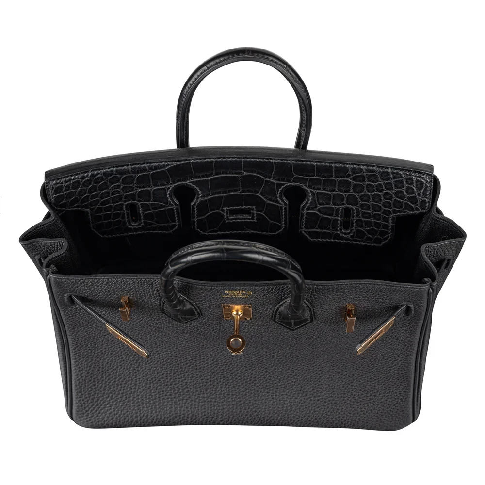 This Hermès style Birkin 25 Touch mixes Black matte alligator and Togo leather for texture rich contrast. Rose gold hardware bridges the sleek 25cm design. Matte alligator resists scratches, while Togo stays supple. Compact yet fits essentials like cards and keys. Pair with monochrome outfits for tactile edge. Quiet luxury with hidden depth.