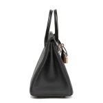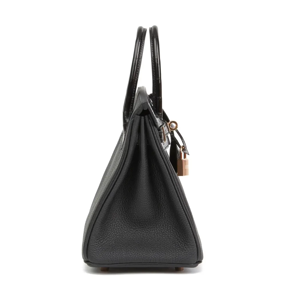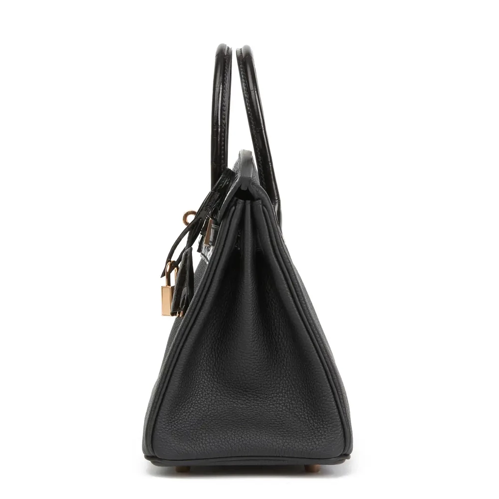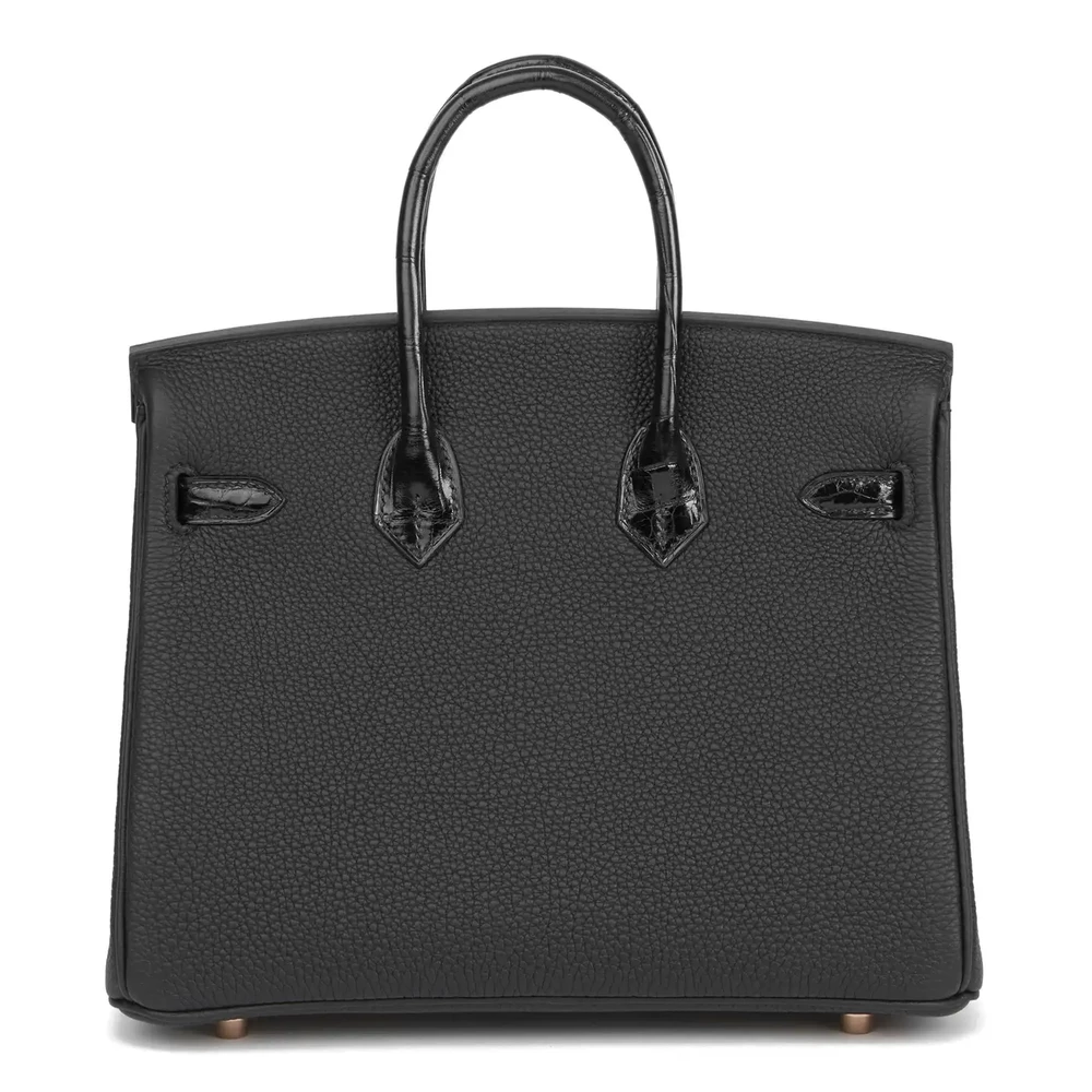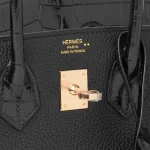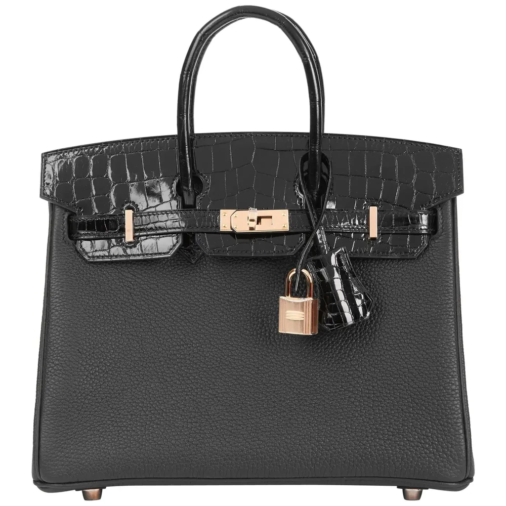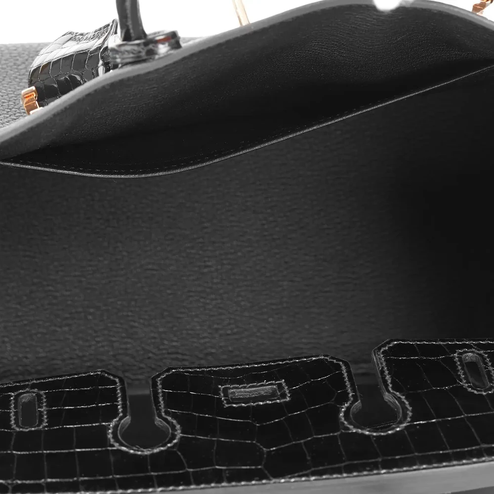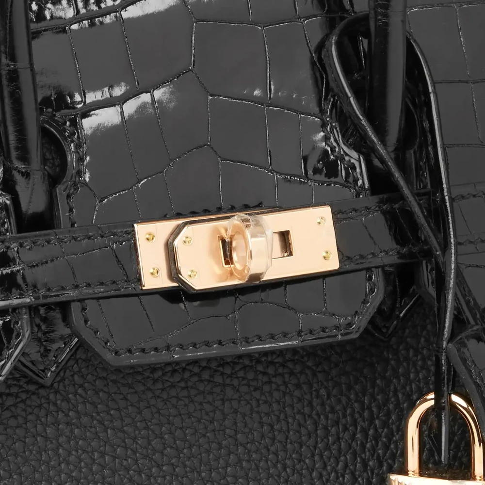 This Hermès inspired Birkin 25 Touch layers Black Togo leather with sleek Niloticus crocodile for monochrome drama. Gold hardware elevates the compact, structured silhouette. The 25cm size fits phones, wallets, and lipsticks. Togo and croc resist scratches with understated polish. Style with leather pants or silk dresses for timeless edge. Perfect for nights out or minimalist wardrobes. Noir mystique.
