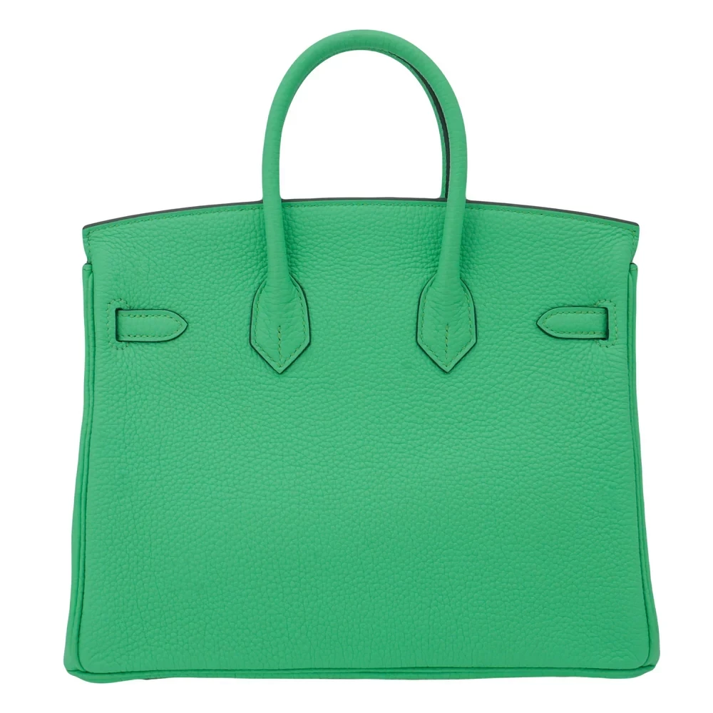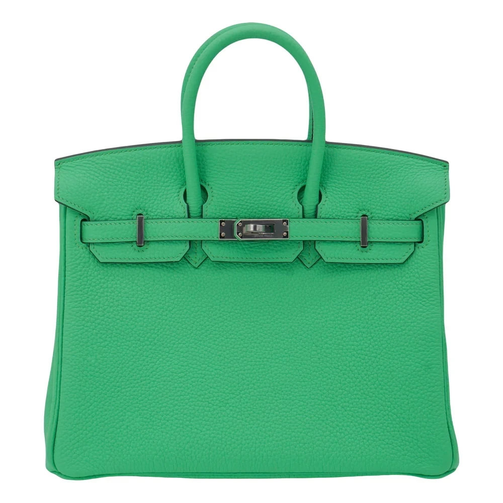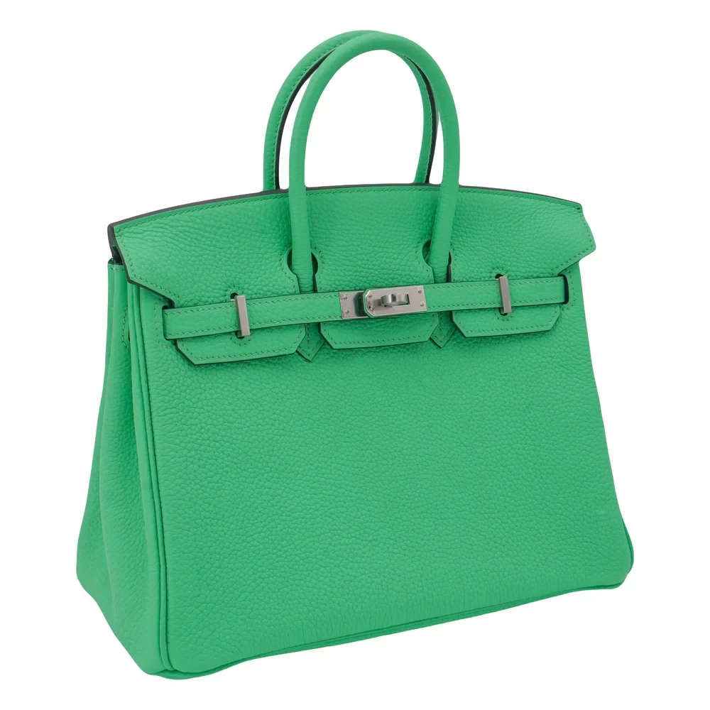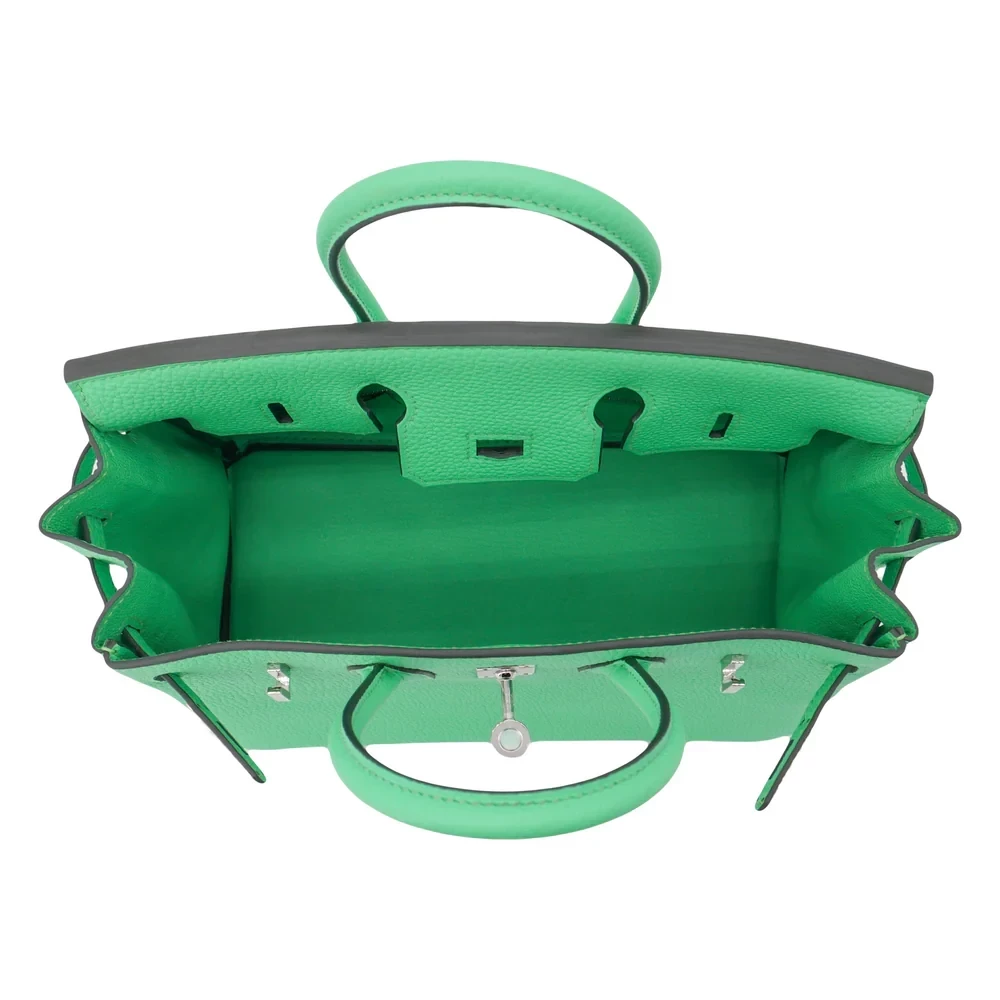 This Hermès style Birkin 25 features Vert Comics Togo leather, a playful lime green hue. Palladium hardware cools the 25cm design with modern edge. Soft Togo leather resists scratches and stays lightweight. Compact yet fits essentials like cards and keys. Pair with neutrals for bold contrast. Perfect for summer adventures or festivals. A burst of youthful energy.