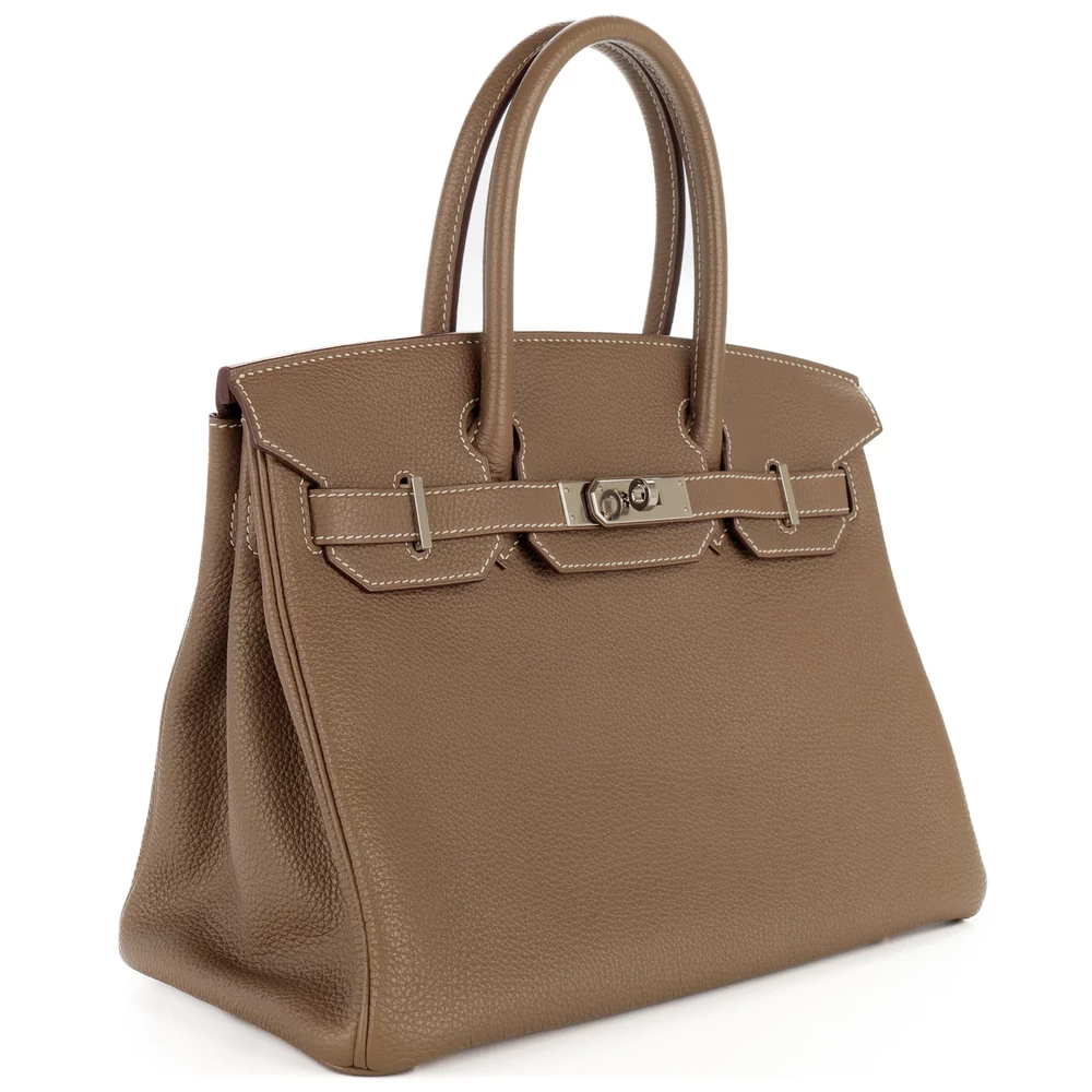 This Hermès style Birkin 30 uses Etoupe Togo leather in cool grey brown. Palladium hardware complements the neutral tone. The 30cm size organizes work laptops and travel gear. Scratch resistant Togo develops a beautiful patina. Works with all color palettes effortlessly. Your perfect everyday companion. Understated luxury for practical lives.