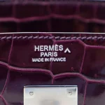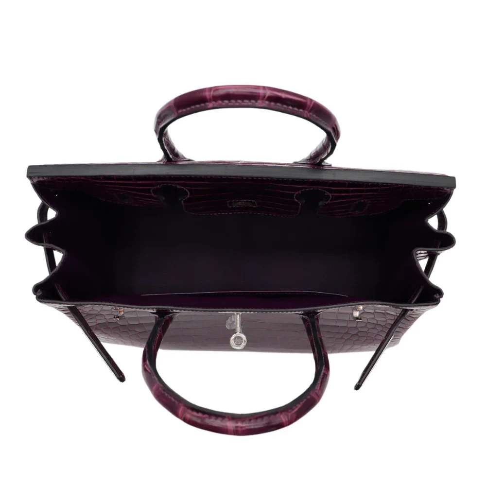 This Hermès style Birkin 30 in Amethyst features glossy purple crocodile leather. The silver palladium hardware adds a sleek contrast to the bold color. The 30cm size holds your laptop, water bottle, and makeup bag with ease. The shiny finish sparkles in sunlight, making it impossible to miss. It’s surprisingly lightweight for such a spacious bag. Pair it with neutral tones to let the color shine. A statement piece for confident fashion lovers.