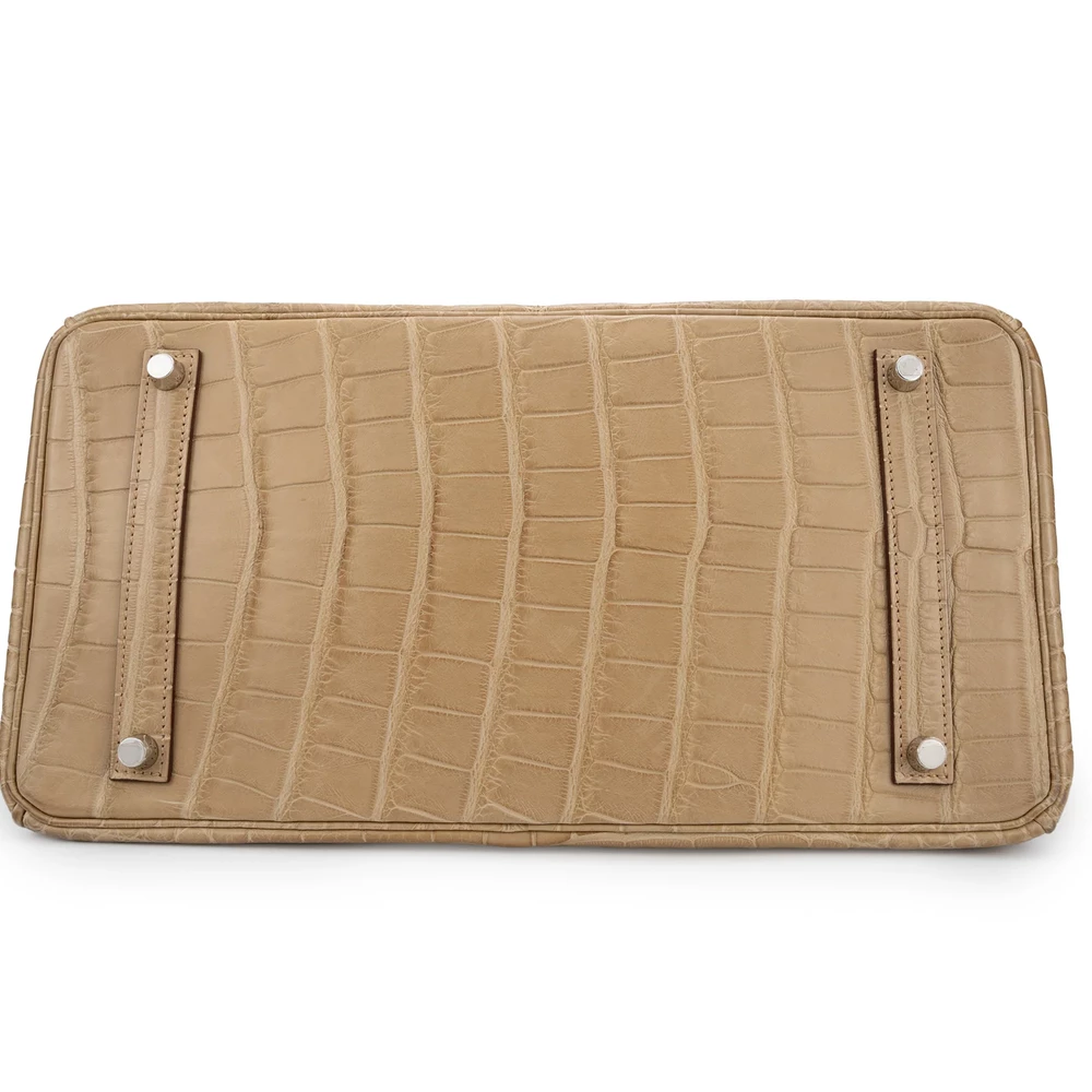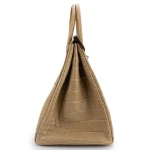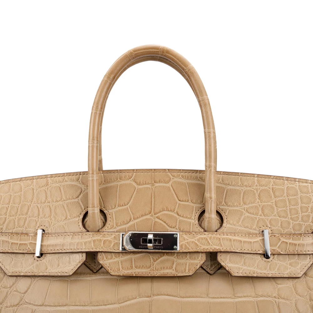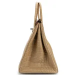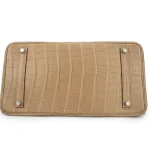 This Hermès Birkin 35 uses matte beige alligator leather for soft, neutral charm. Palladium hardware adds modern shine. The 35cm size fits laptops, scarves, or extra layers. Alligator leather stays scratch proof and classy. Style with pastels or earth tones for calm elegance. Great for work or travel. Quiet and timeless.
