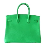 This Hermès inspired Birkin 35 shines in vivid Bambou Epsom leather. Gold hardware outlines the structured shape and angular sangles. The 35cm spacious interior organizes tech gadgets and cosmetics. Epsom leather repels stains and stays rigid. Contrast with monochrome outfits for bold pop. Designed for fashion weeks, vacations, or statement errands. A burst of modern vitality.
