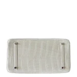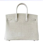 This Hermès inspired Birkin 35 features Beton matte alligator leather in soft taupe tones. Palladium hardware adds cool contrast to the exotic texture. The 35cm size carries laptops, documents, and luxury essentials. Matte alligator resists scratches and maintains understated elegance. Pair with neutrals or pastels for minimalist chic. Ideal for work, travel, or high profile meetings. Quiet confidence, artisan crafted.