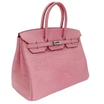 This Hermès style Birkin 35 glows in Bubblegum matte alligator leather, a playful pastel pink. Palladium hardware cools the oversized 35cm design. Matte alligator stays scratch resistant and lightweight. Roomy enough for laptops or travel gear. Pair with neutrals to let the pink pop. Perfect for spring events or creative workplaces. Sweetness meets boldness.