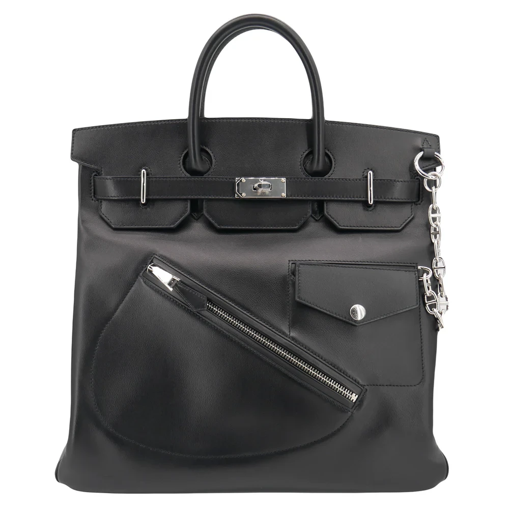 This Hermès style HAC 40 features Rock Black Volupto leather. Palladium hardware adds edgy contrast. The 40cm design offers urban functionality with rocker chic appeal. Durable leather resists scuffs and rain. Pair with leather jackets for bold flair. Your perfect companion for city nights. Rebel luxury for modern mavericks.