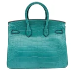 This Hermès inspired Birkin 25 features Bleu Paon matte alligator leather, a peacock blue jewel tone. Gold hardware elevates the 25cm silhouette with opulent contrast. Matte alligator resists scratches while retaining refined texture. Roomy enough for cards, keys, and lipstick. Pair with neutrals or metallics for bold flair. Lightweight and perfect for special occasions. A regal statement of modern luxury.